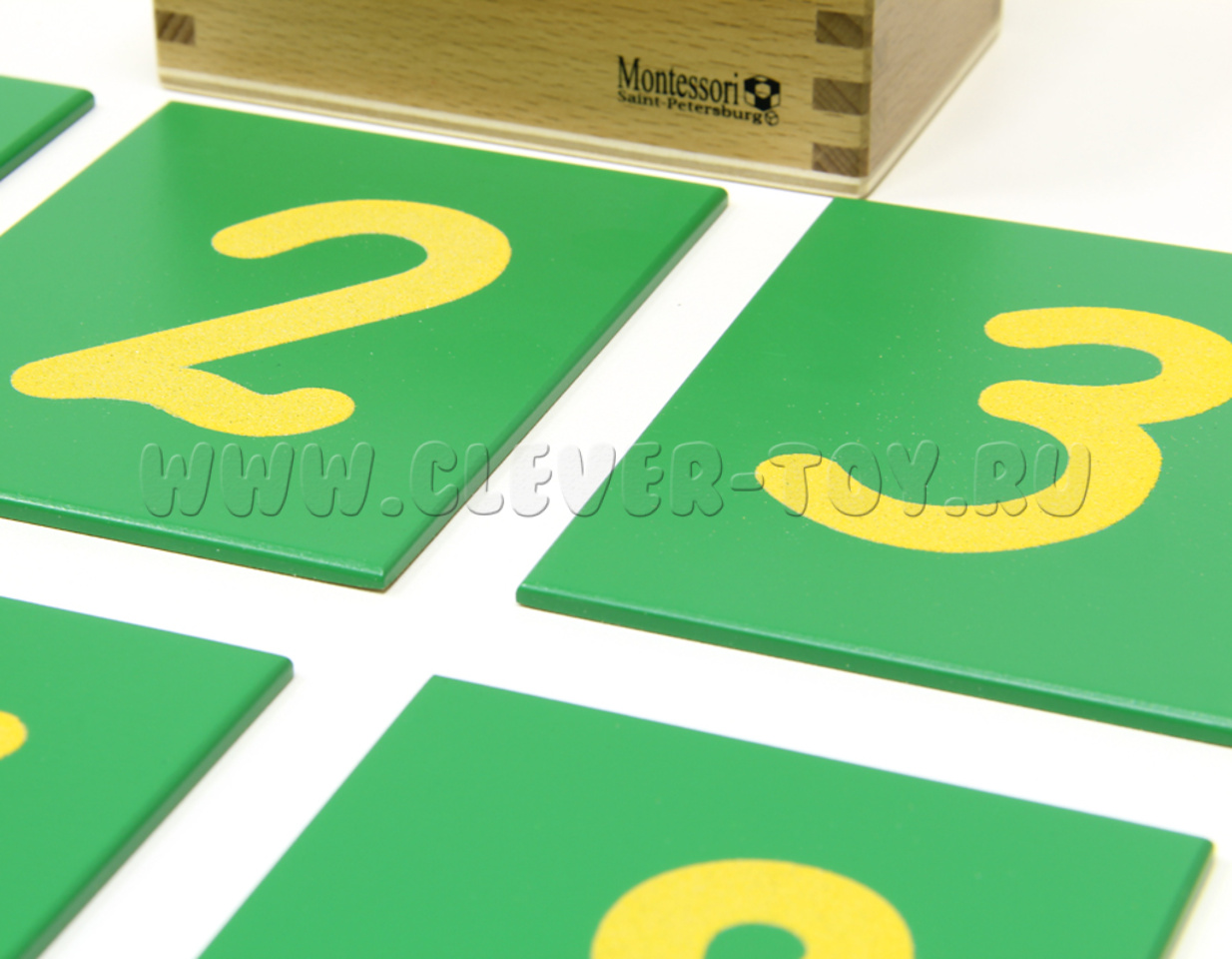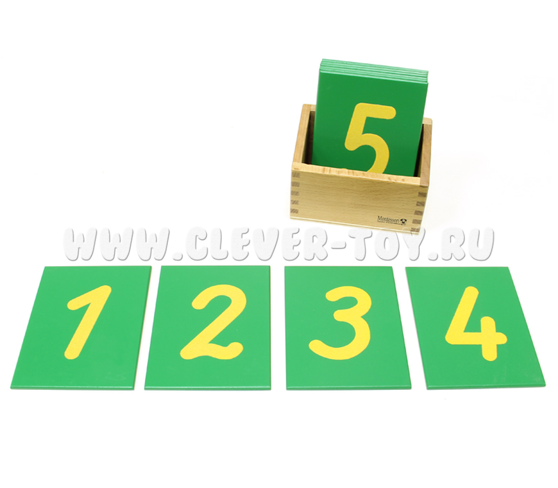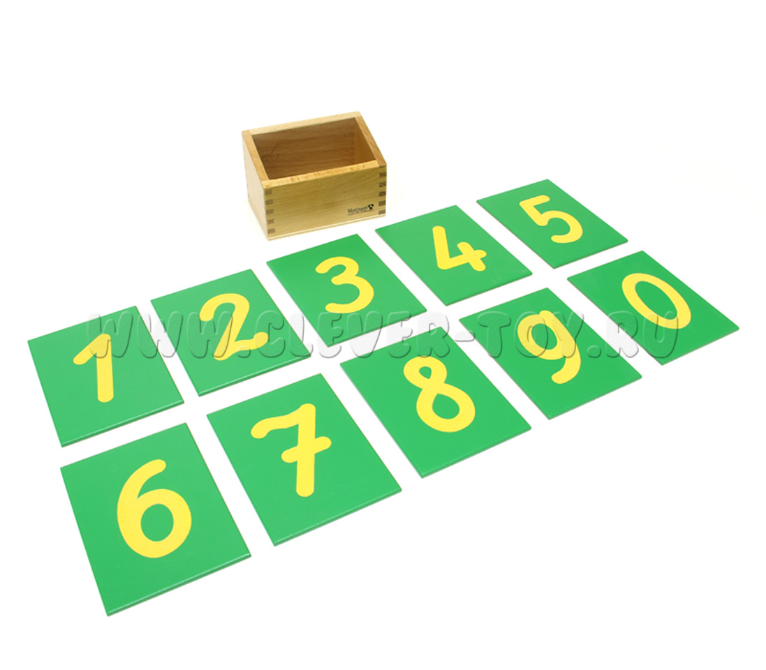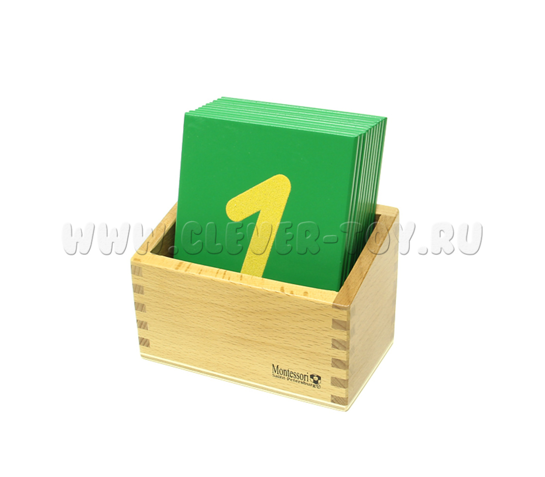 В ящике, выполненном из бука, находятся дощечки зеленого цвета с нанесенными на них песочными цифрами от 0 до 9. Ребёнок получает письменный символ к количеству и связывает его с названием.
