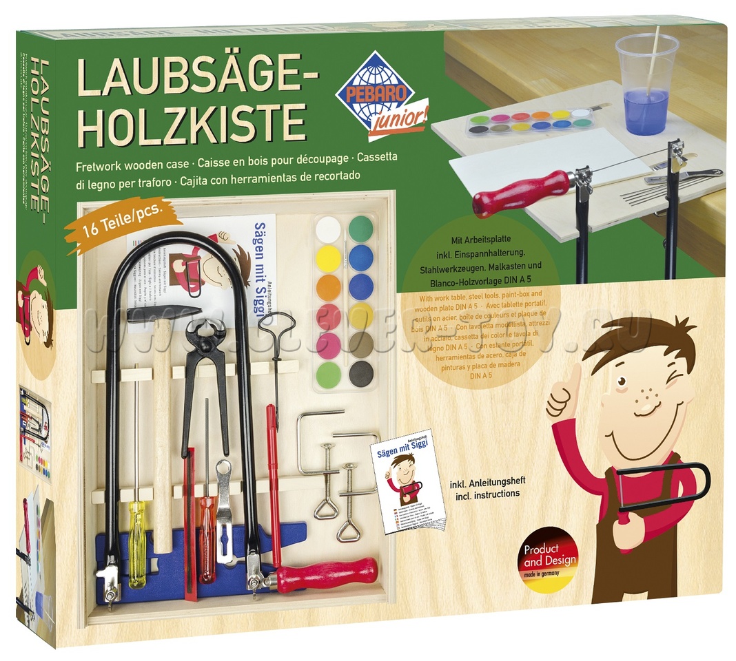 Отличительная черта набора - большой выпиловочный столик, чтобы можно было рисовать, склеивать и пилить, не повреждая ваш собственный стол. В самом наборе можно найти высококачественные инструменты, фанерные шаблоны и акварельные краски.