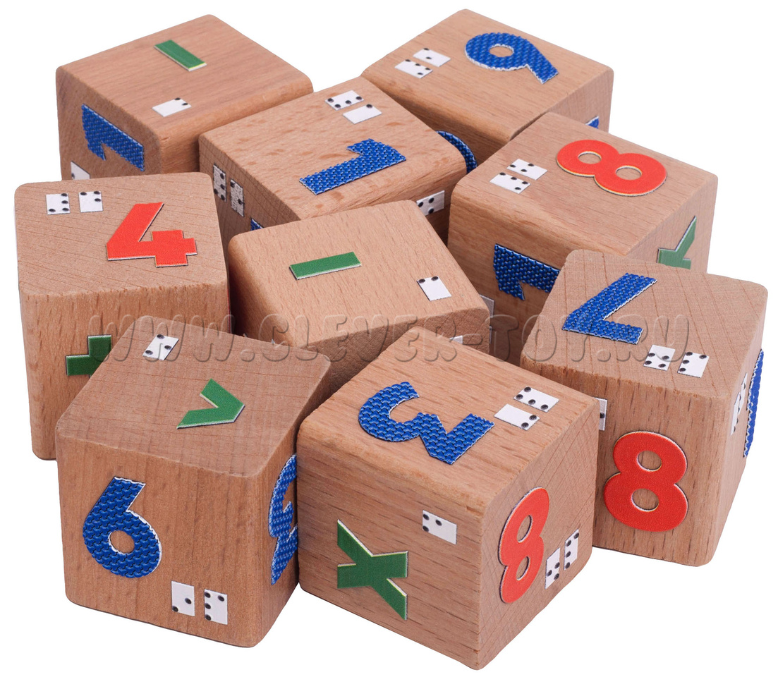 • на грани кубиков нанесены математические знаки: "плюс", "минус", "равно", "больше", "меньше", "умножение", "деление" и их обозначения шрифтом Брайля.