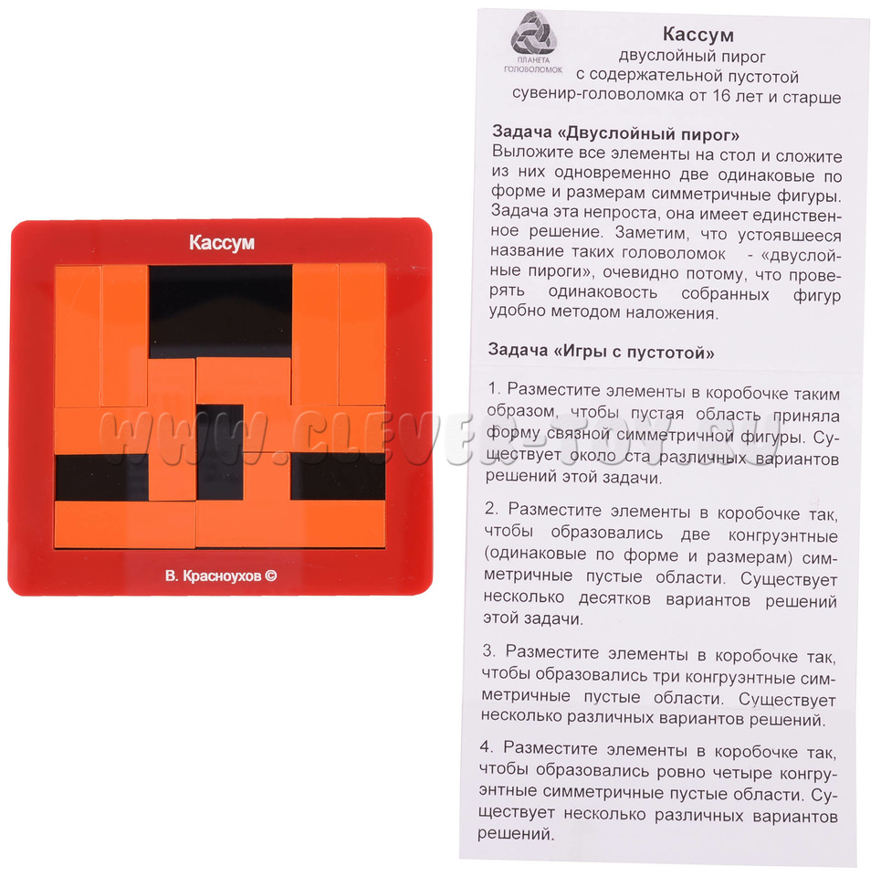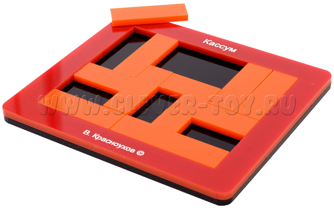 Головоломка "Кассум" это увлекательная игра для ума из пластиковых деталей. Она подойдёт и детям от 10 лет, и взрослым: можно играть самому или соревноваться с друзьями, кто быстрее справится с заданиями.
