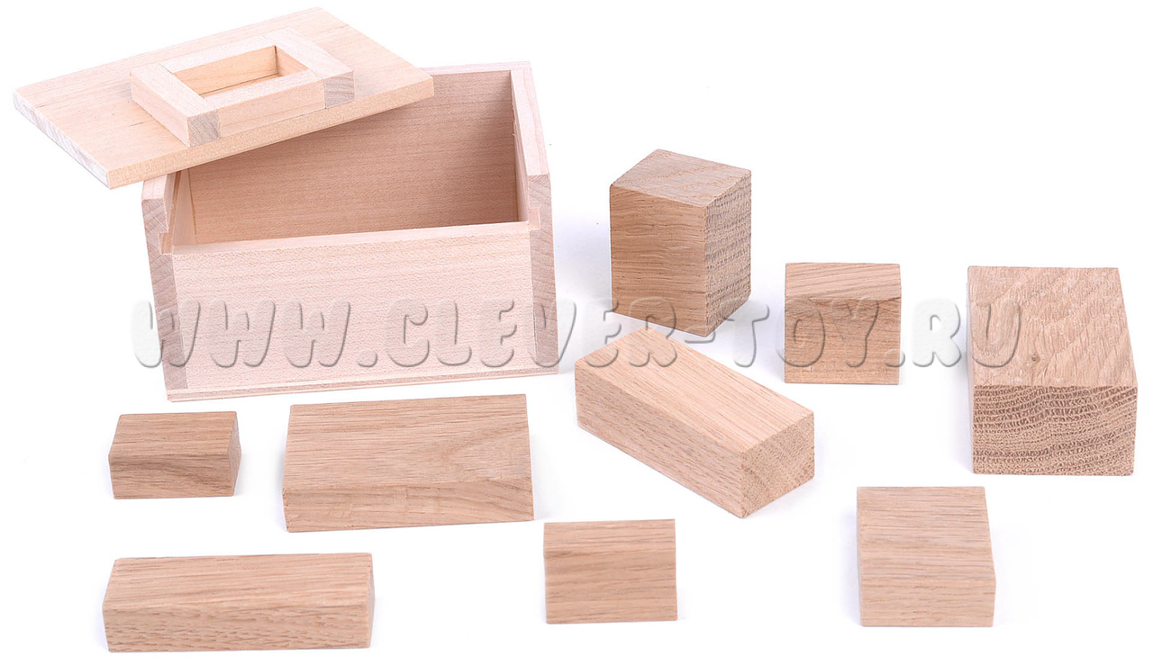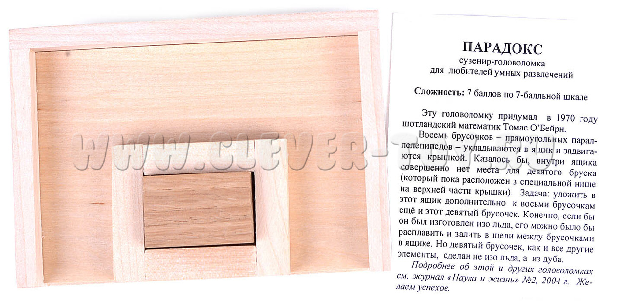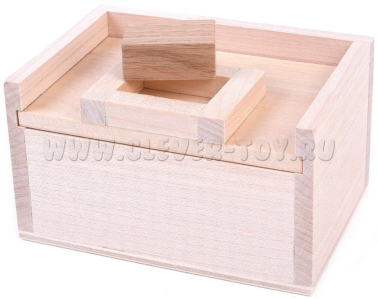 8 прямоугольных параллелепипедов укладываются в ящик и задвигаются крышкой. Казалось бы, внутри ящика совершенно нет места для девятого бруска (который пока расположен в специальной нише на верхней части крышки).