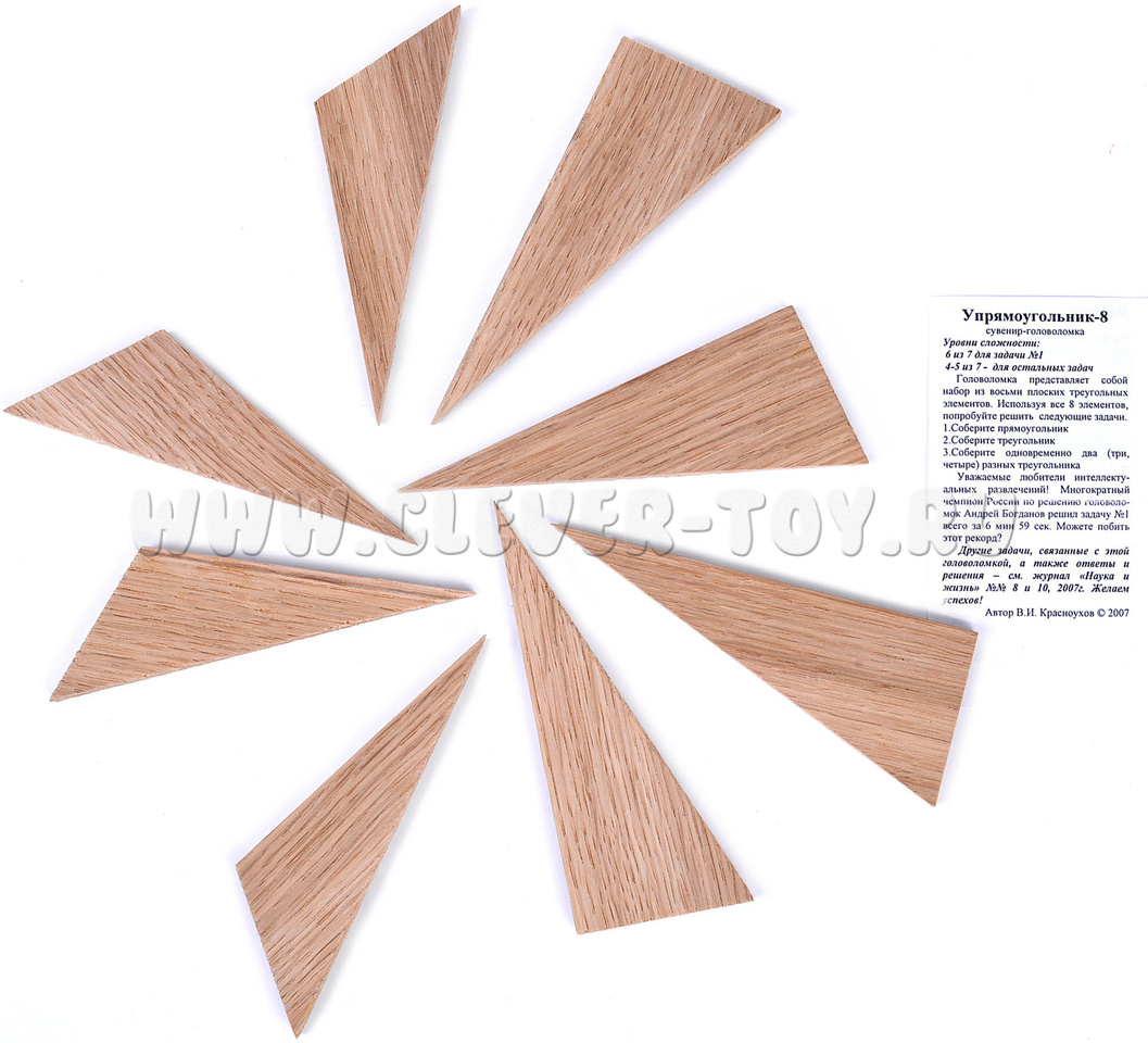 Игрушки-головоломки имеют большое значение в развитии у детей и взрослых. Одной из интересных головоломок является “Упрямоугольник-8”, состоящий из восьми деревянных треугольников.