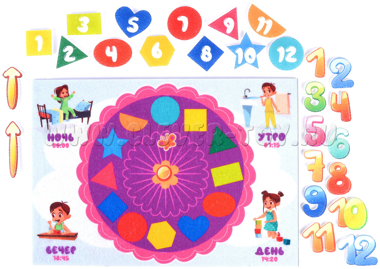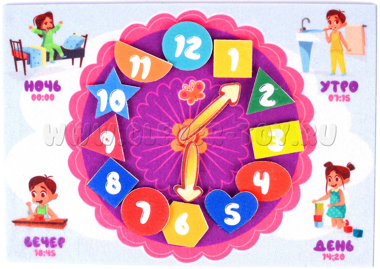 Во-вторых, каждый набор Веселых липучек посвящен определенной тематике. Этот – времени. Эта многоразовая аппликация поможет детям познакомиться с часами и временными промежутками.