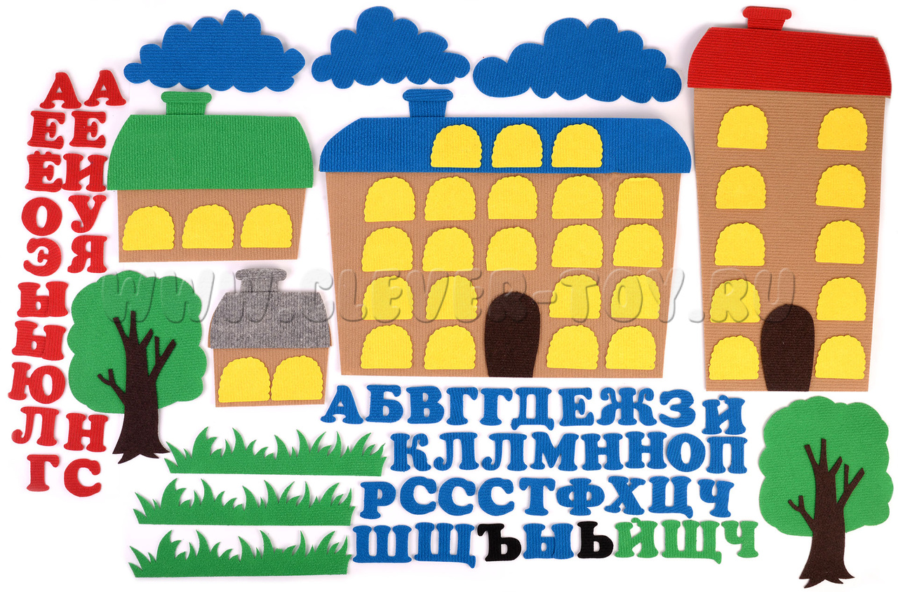 с красной крышей – для гласных букв с 10 окнами (размер: 27х50 см),