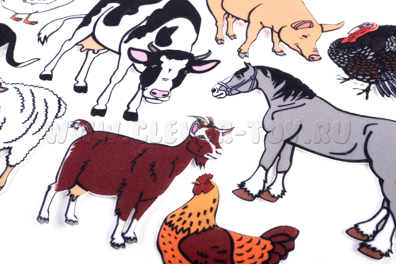 • 13 игровых элементов с изображением лошади, индюка, коровы, кролика, кота, собаки, овцы, свиньи, утки, курицы, петуха, гуся, козы.