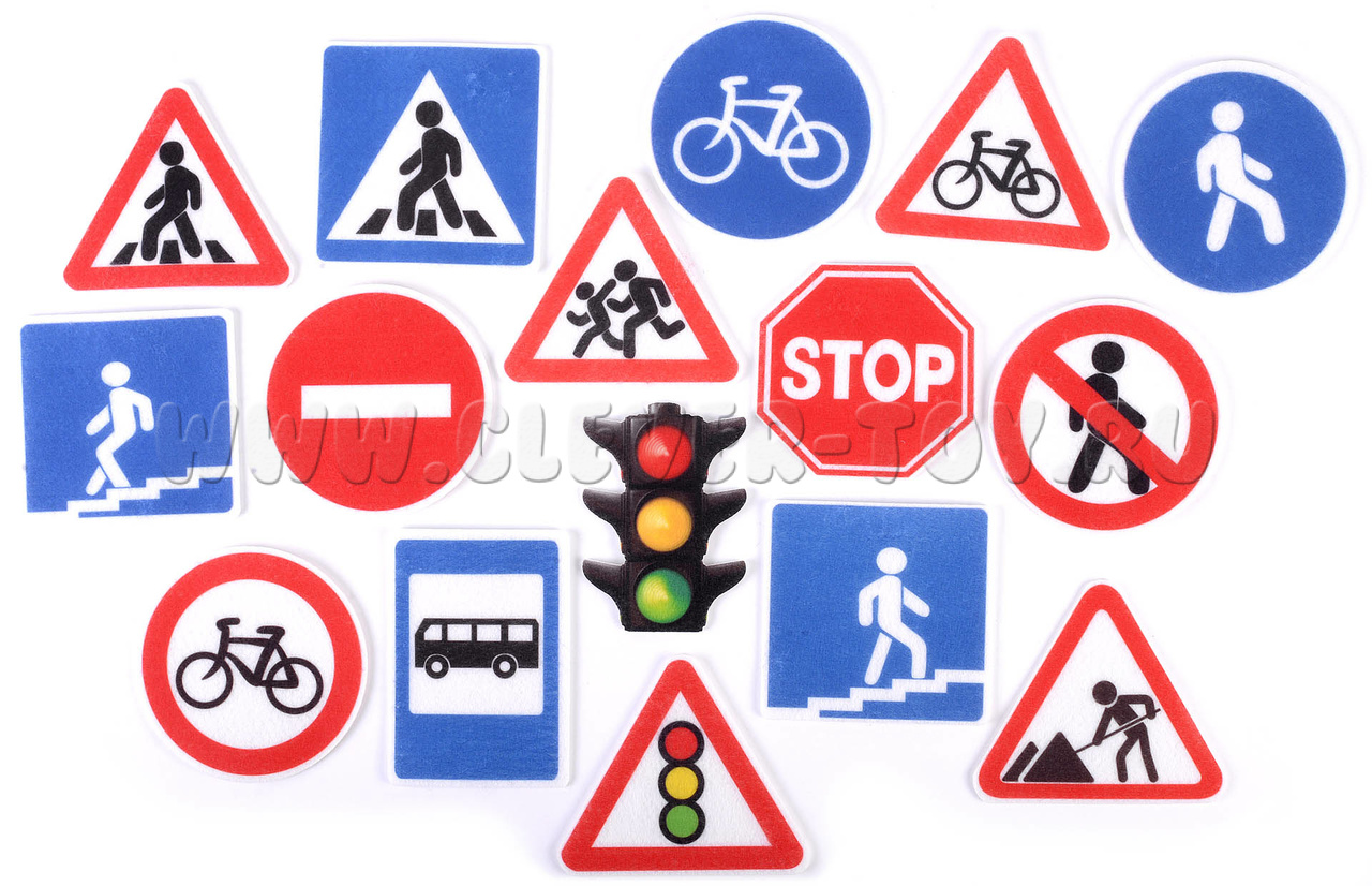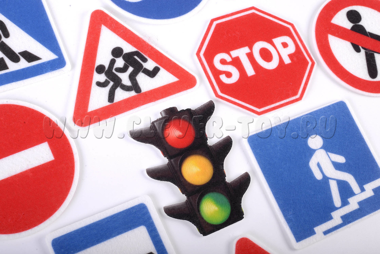 • Основные и самые распространённые дорожные знаки – 16 игровых элементов, среди которых изображения светофора, знаки «Место остановки автобуса», «Пешеходный переход», «Въезд запрещён», «Велосипедная дорожка», «Дорожные работы», «Внимание, дети!» и др.;