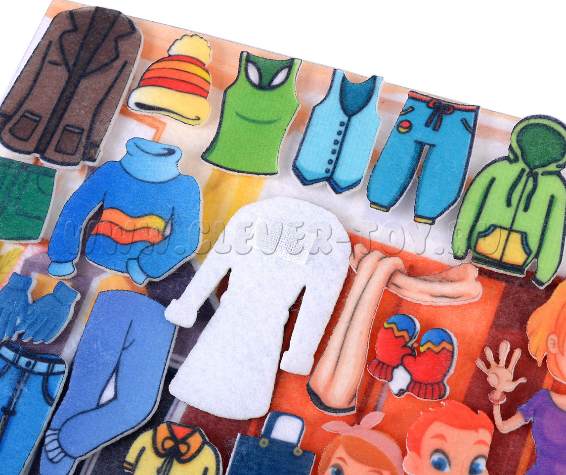 В чем папа пойдет на работу? Как не испачкаться на кухне? В какое время года надеть шапку и варежки? На этот и другие вопросы малыш отыщет ответы, наряжая веселую семью в пальто и платьица. Можно даже придумать историю о приключениях домочадцев и разыграть ее по ролям.
