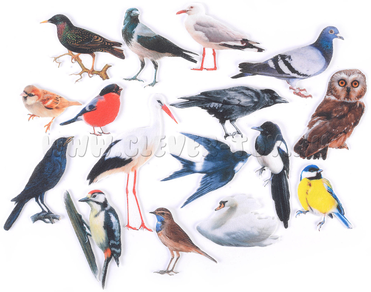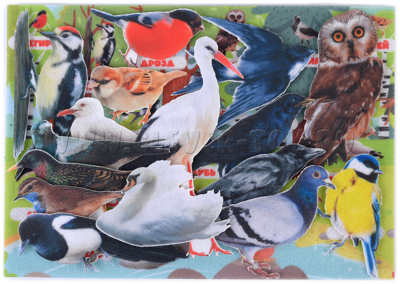 • Набор из 16 фигурок птиц на липучках (снегирь, дятел, дрозд, сова, ворона, воробей, ласточка, соловей, синица, сорока, скворец, голубь, чайка, аист, лебедь, грач)