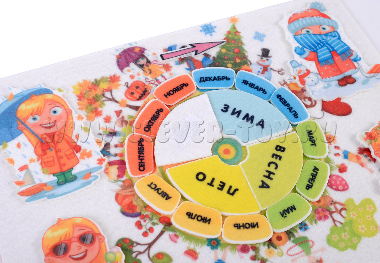 • фигурки с надписями – 12 шт. для каждого месяца и 4 шт. со временами года: лето, осень, зима, весна; надписи сделаны чёткими печатными буквами, каждое время года имеет свой узнаваемый цвет для удобства группировки;