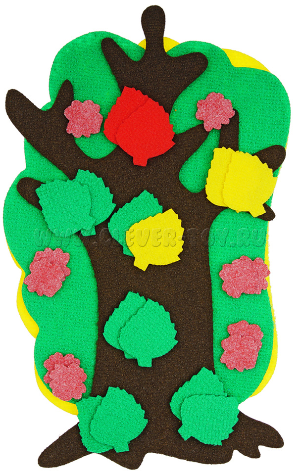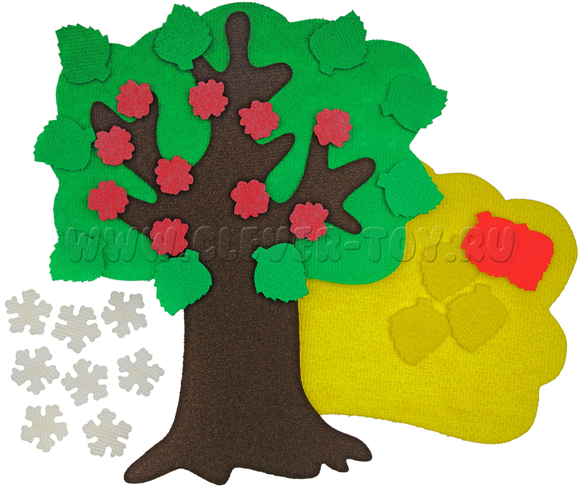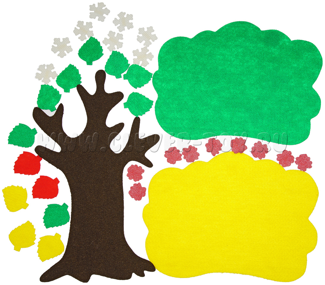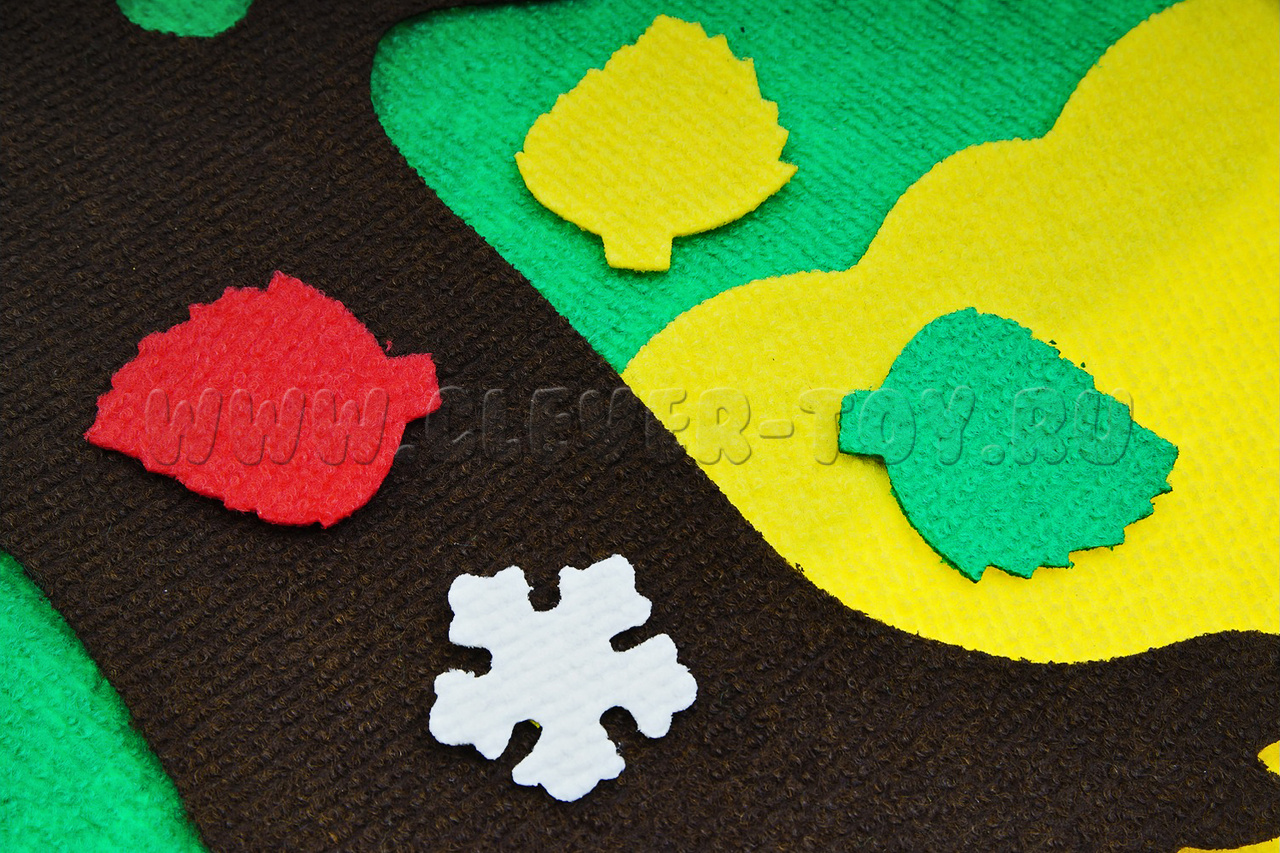 • снежинки 10 шт., листочки зелёные 10 шт., листочки жёлтые 10 шт., цветочки 10 шт.;