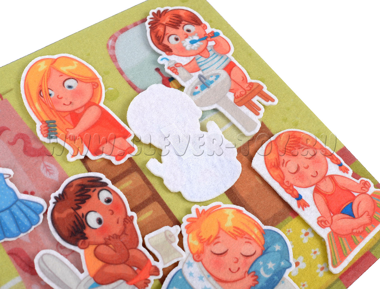 • 9 фигурок: ребёнок, сидящий на горшке, ребёнок, который чистит зубы, кушает, занимается йогой, расчёсывается, спит, одевается, ребёнка, принимающего ванную, ребёнка, закутанного в полотенце после купания;