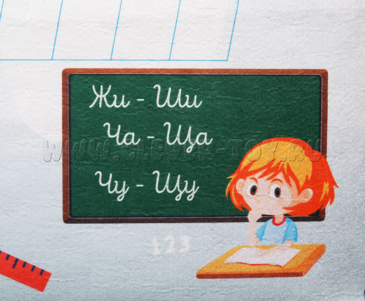 В упаковке находится большое игровое панно с нанесёнными на него клетками под нужным наклоном, что поможет детям в игровой форме познакомиться с понятиями «Печатные» и «Прописные» буквы. В дальнейшем – в начальной школе – ребёнок будет готов к прописям. Вокруг клеток также есть изображения различных школьных атрибутов, маленькая школьная доска с первыми и важными правилами русского языка: «Жи-ши, Ча-ща, Чу-щу».