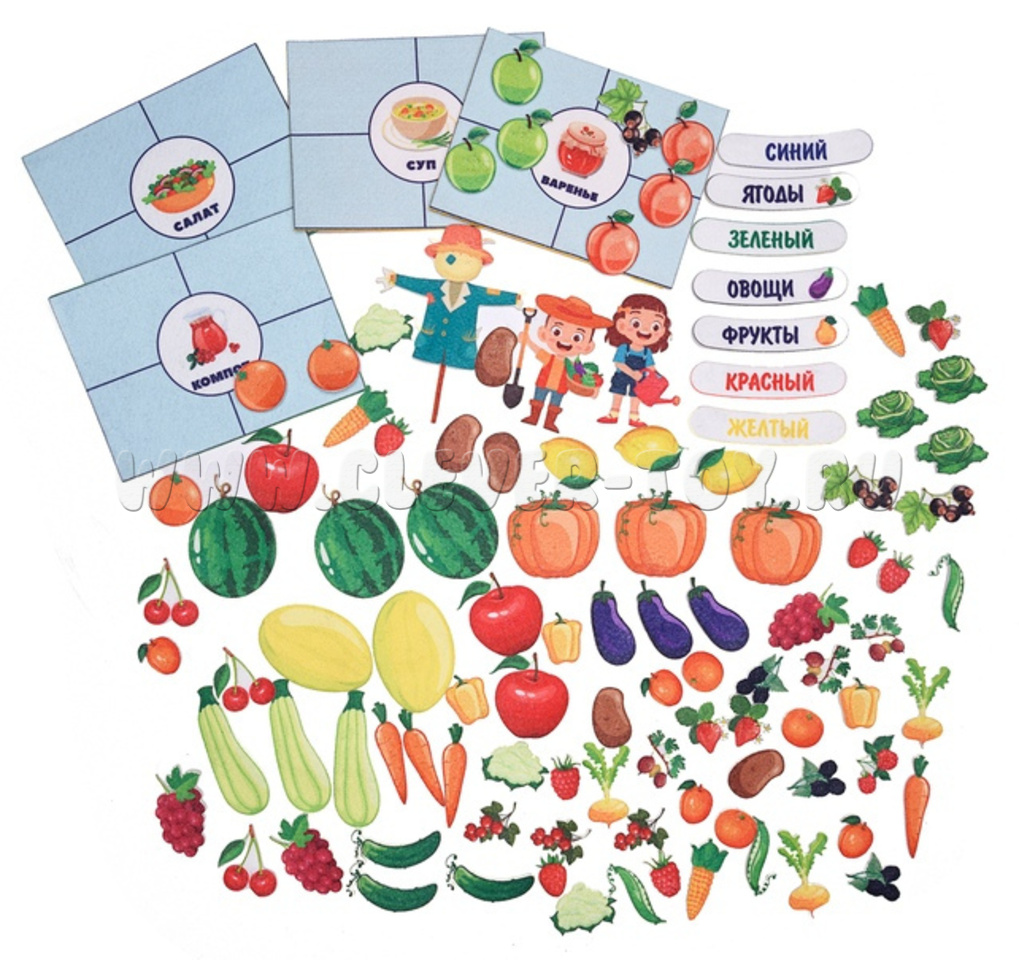Игра «Сад и огород» — это увлекательное обучающее пособие для детей дошкольного возраста, которое поможет им узнать больше о фруктах, ягодах и овощах, а также о том, где и как они растут.
