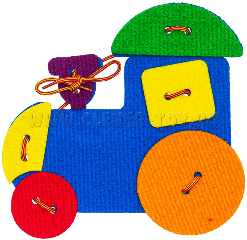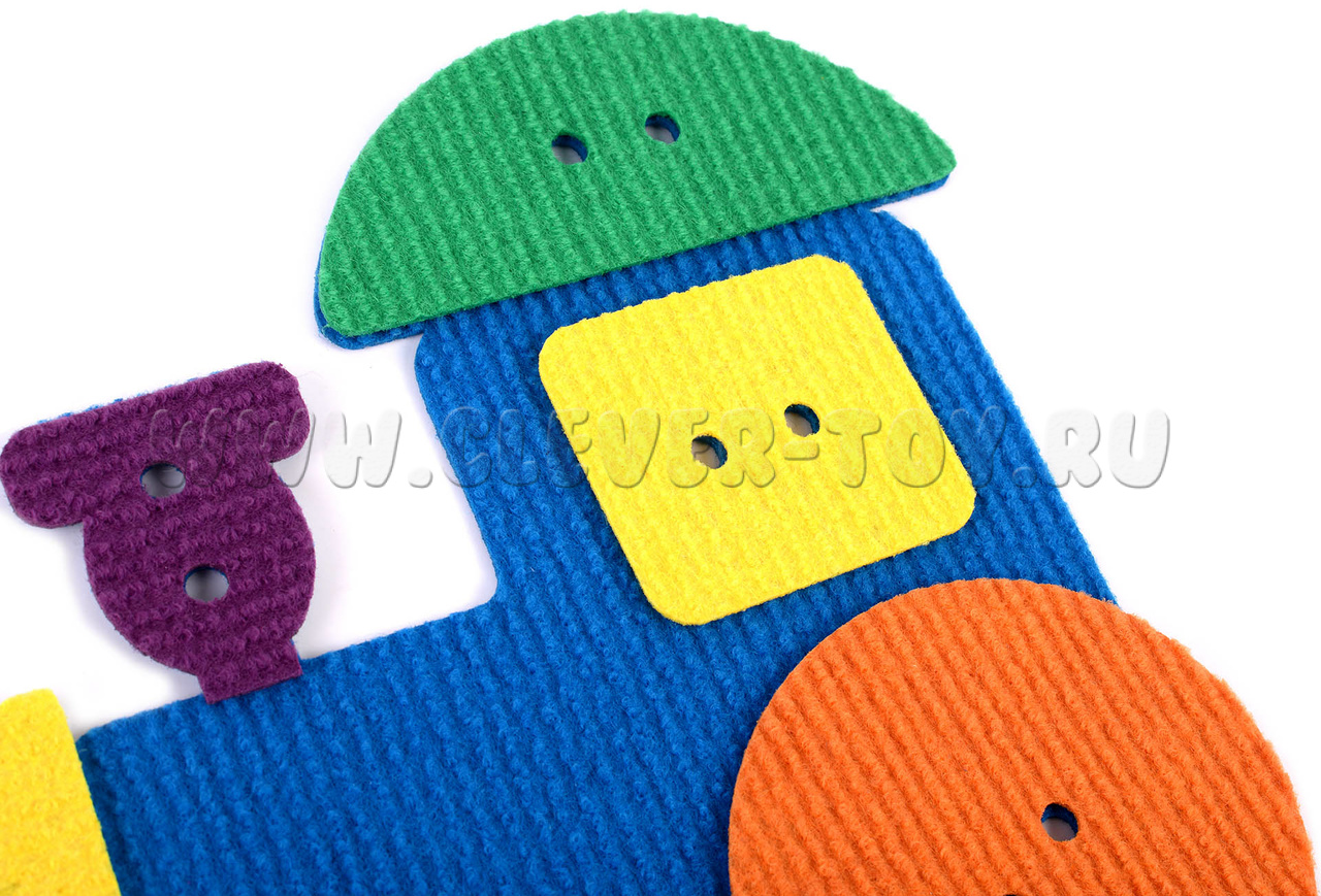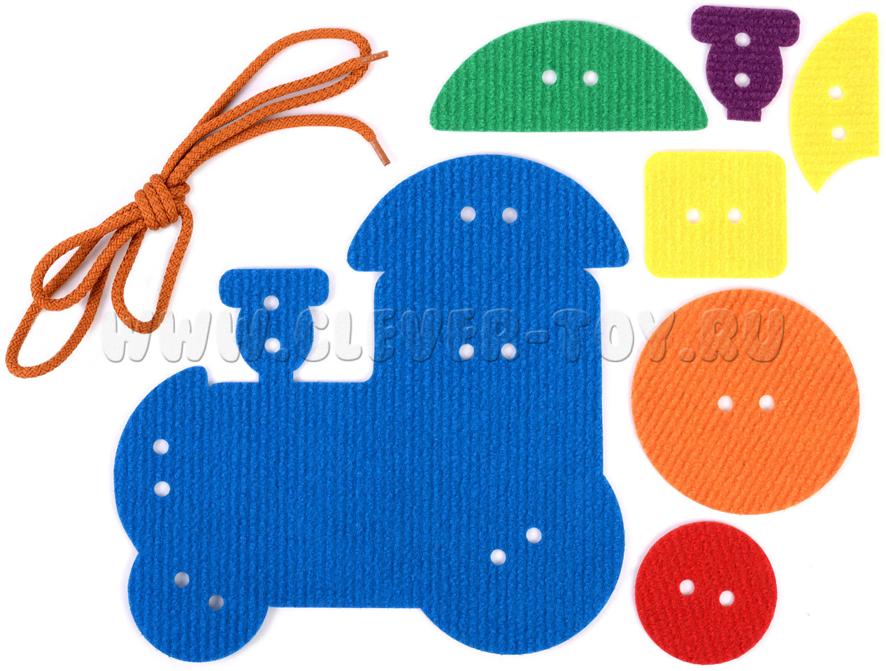 Например, игра «Как устроен паровоз» - для самых маленьких. Вместе с малышом изучите детали паровоза и сложите их на столе. Затем начните по очереди соединять элементы – накладывать друг на друга, а затем пропускать шнурок/нанизывать шнурок на элемент, после чего прикреплять его к основной фигуре. Для старших дошкольников – игры «Геометрические фигуры», «Найди ошибку».