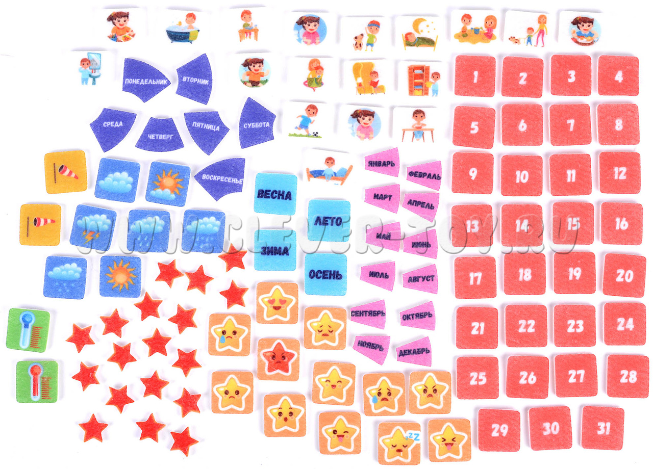 - Набор из 110 деталей (эмоции, осадки, ветер, температура, цифры, дни недели, месяцы, сезоны, распорядок дня, звездочки),