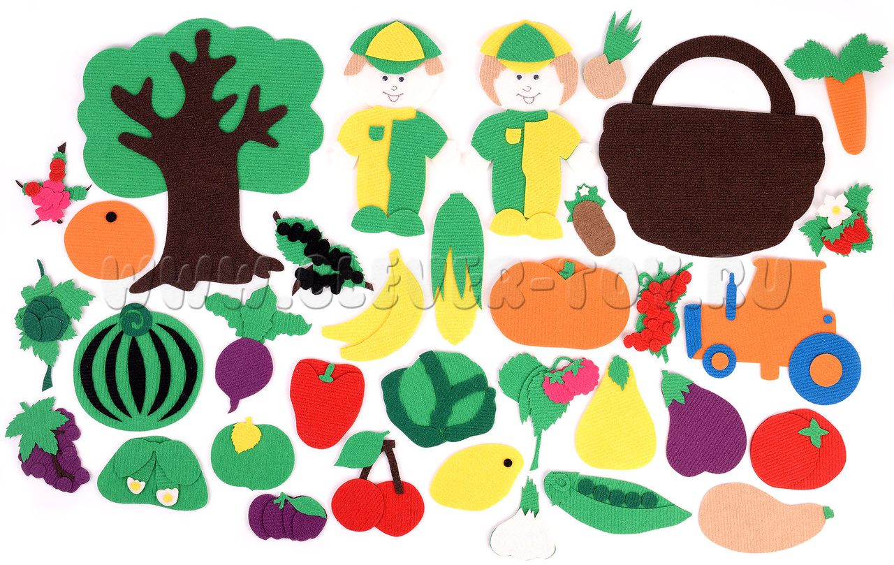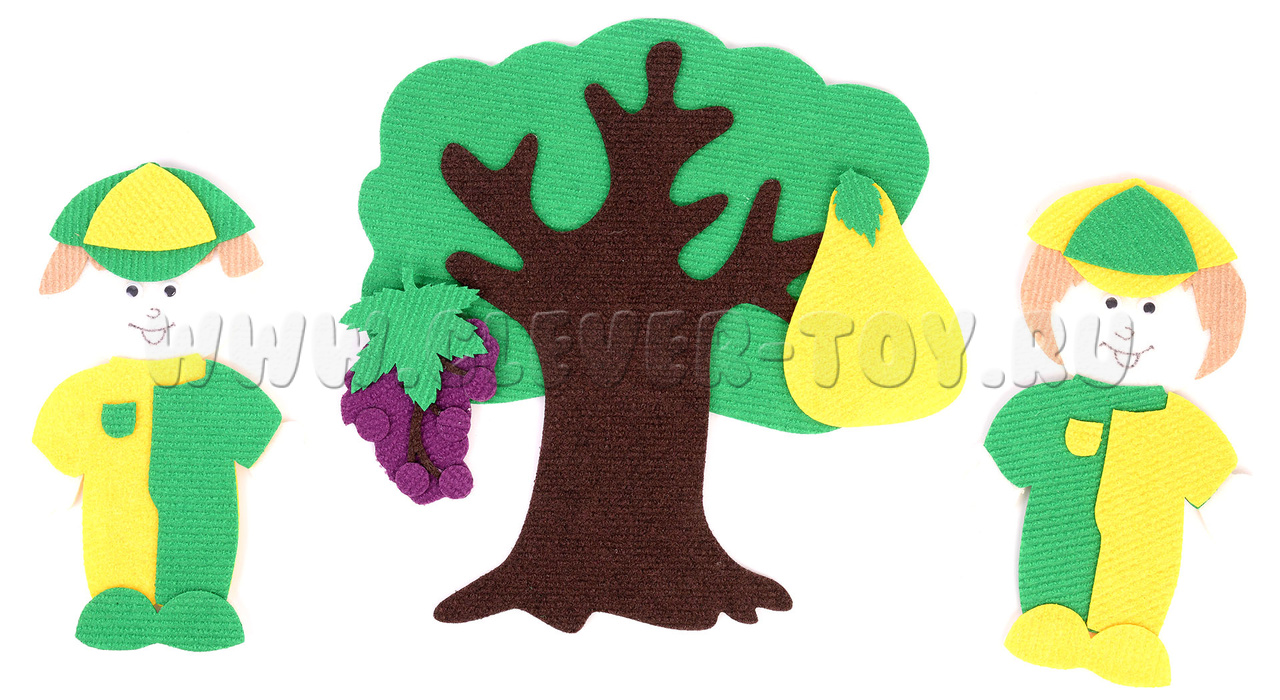 • герои – мальчик и девочка (каждый по 25*15 см); предметы – трактор (20*15 см), дерево (30*30 см), корзина (26*26 см);
