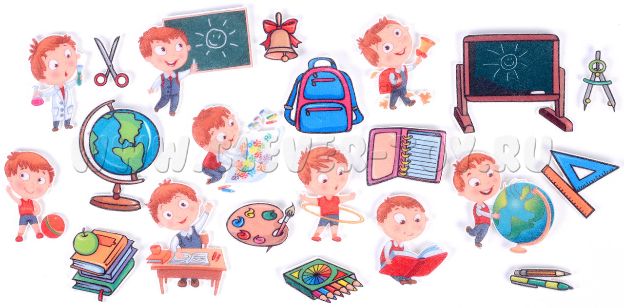 • 8 фигурок учеников с предметами-символами разных уроков – химия, физкультура, чтение, рисование и др.;