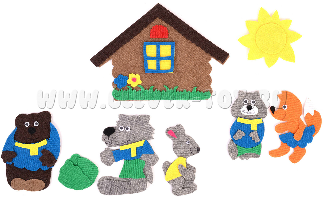 • персонажи – дед, бабка, внучка, жучка, кошка, мышка маленькая, колобок, кот, курочка Ряба, журавль, мышка-норушка, лягушка, ёжик, петушок, зайка белый, зайка серый, волк, лиса, медведь, соломенный бычок, 2 собаки, 2 охотника, матушка, медведица, медвежонок, коза, 7 козлят, 3 поросёнка;