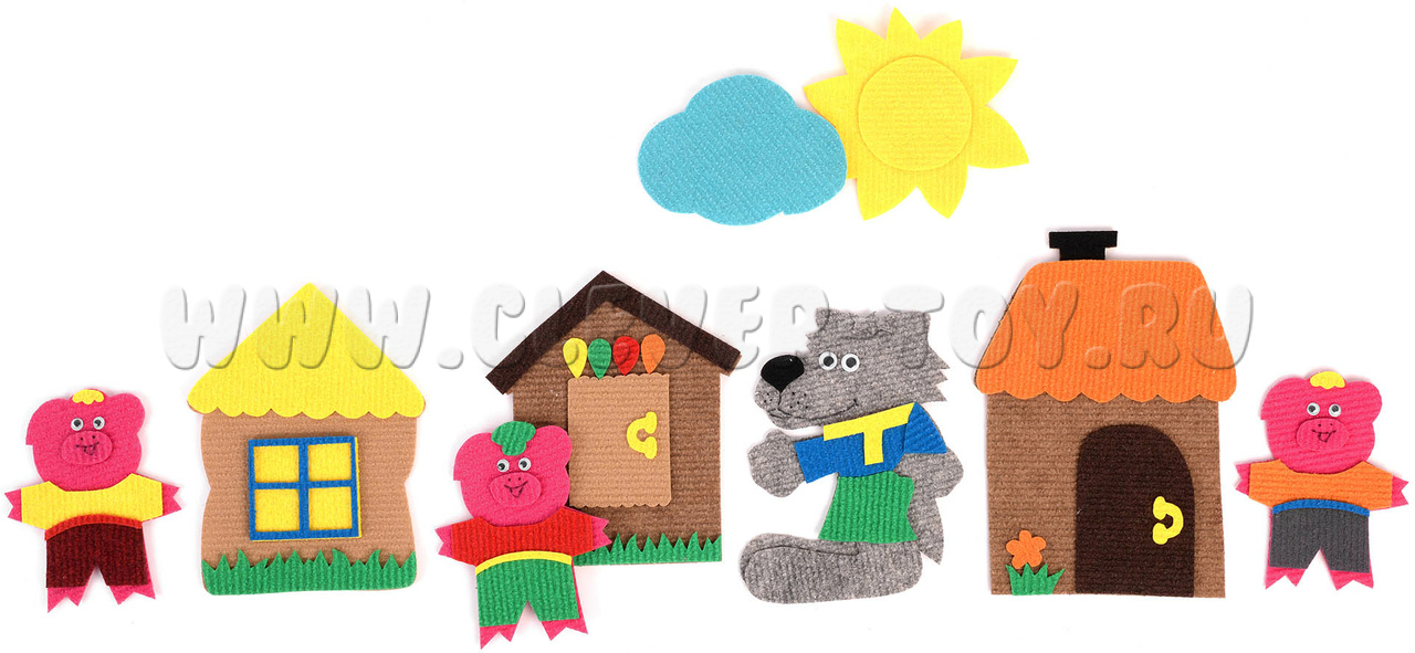 • декорации – солнышко, тучка, облако, дерево, ёлка, пень, гриб, костёр, домики для поросят 3 штуки, ледяная избушка, теремок, миски 3 штуки, ложки 3 штуки, стулья 3 штуки, кроватки 3 штуки.