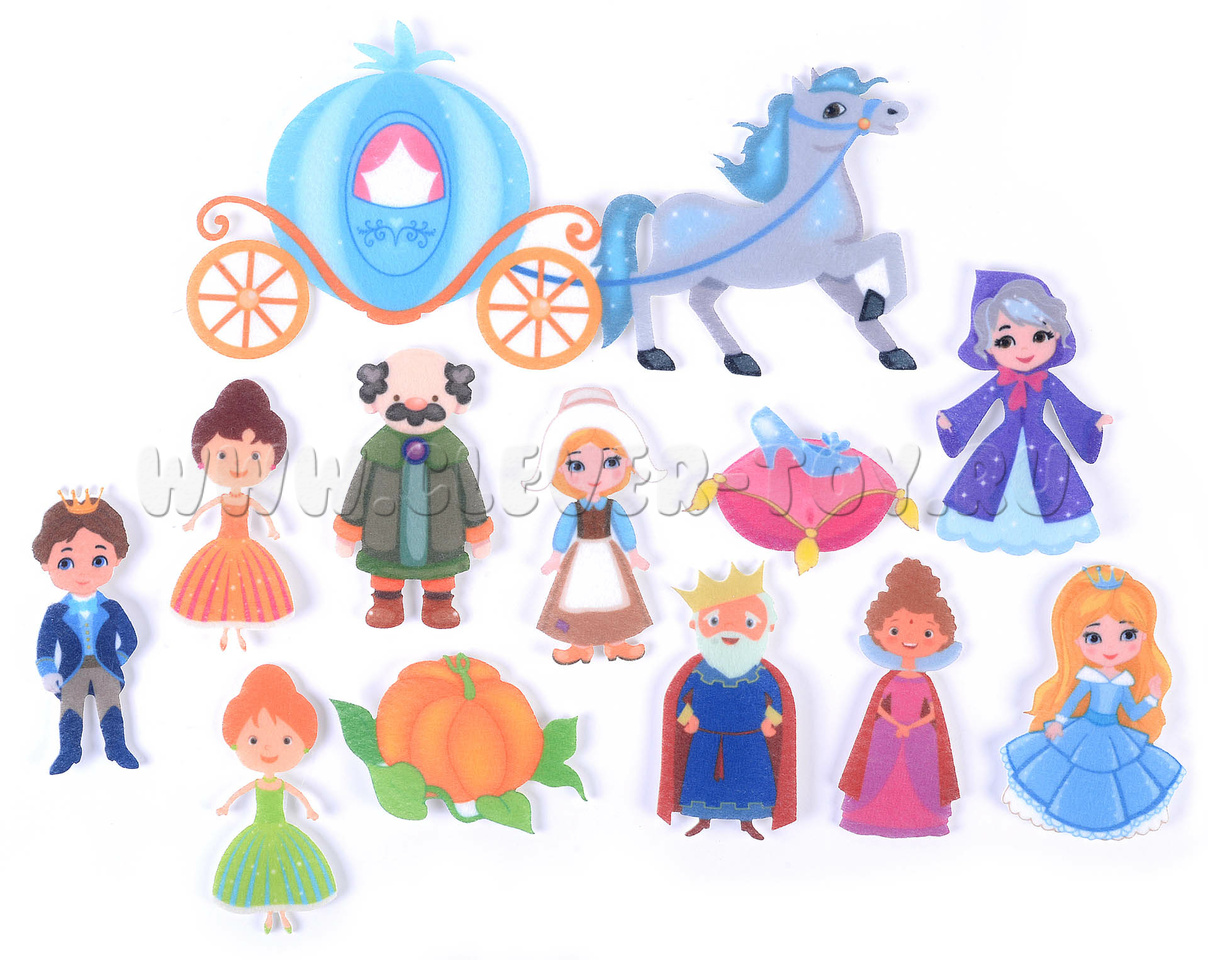 • Фигурки персонажей: Золушка в повседневном и бальном платьях, ее отец, мачеха, сводные сестры, крестная фея, принц, король, тыква, карета, запряженная лошадью и хрустальная туфелька (12 шт.).