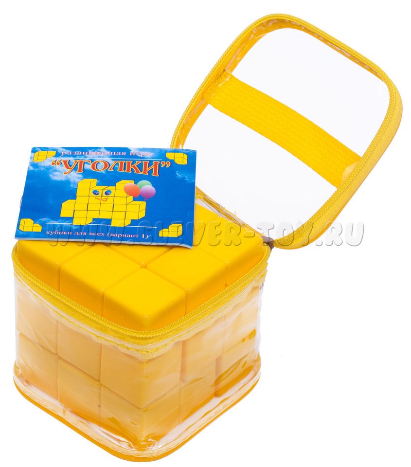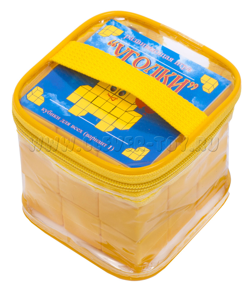 Игра «Уголки» состоит из 9 элементов, каждый из которых склеен из 3-х одинаковых кубиков (жёлтые кубики). Для более разнообразных вариантов игр рекомендуется использовать вариант игры 1 вместе с вариантом игры 2 «Собирайка» из 6 фигур, похожих на букву «Г» и одного «уголка» (оранжевые кубики + одна жёлтая деталь).