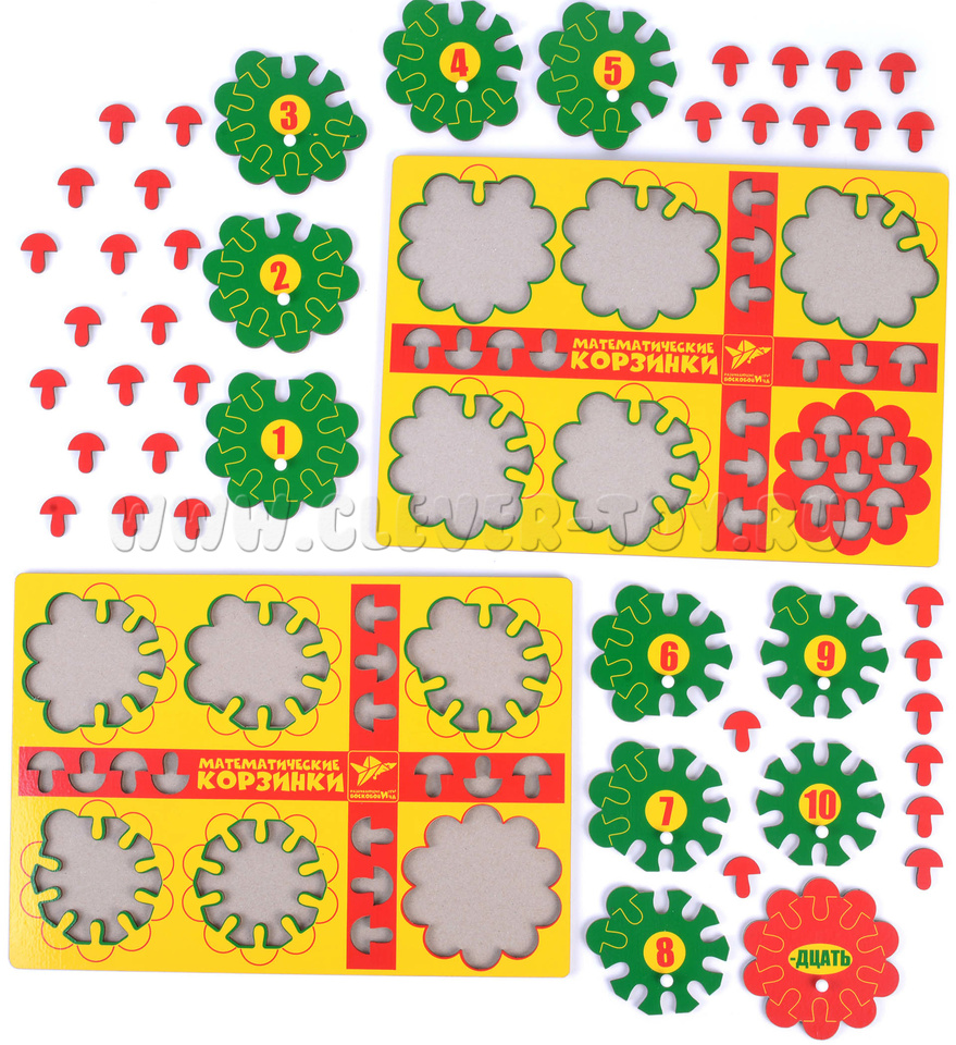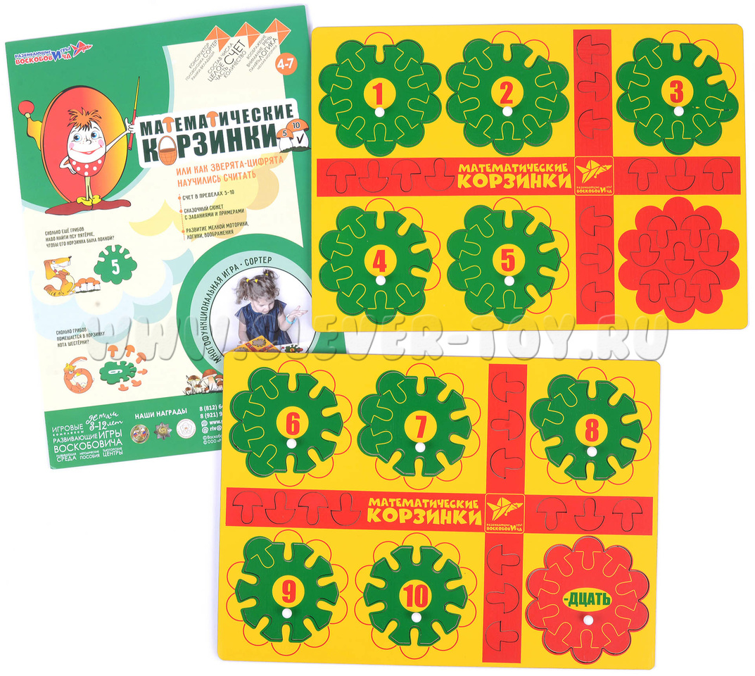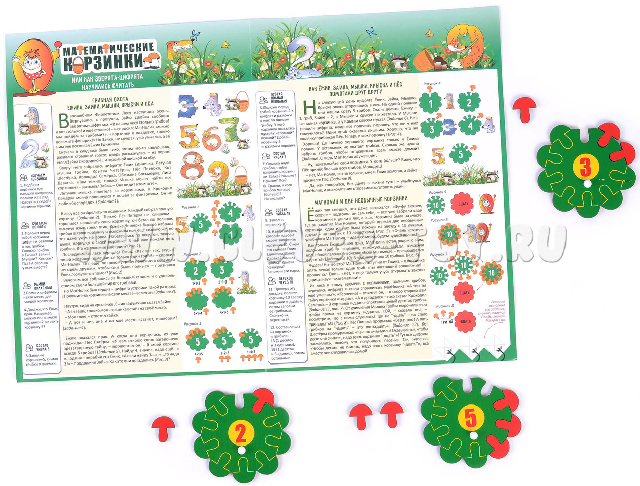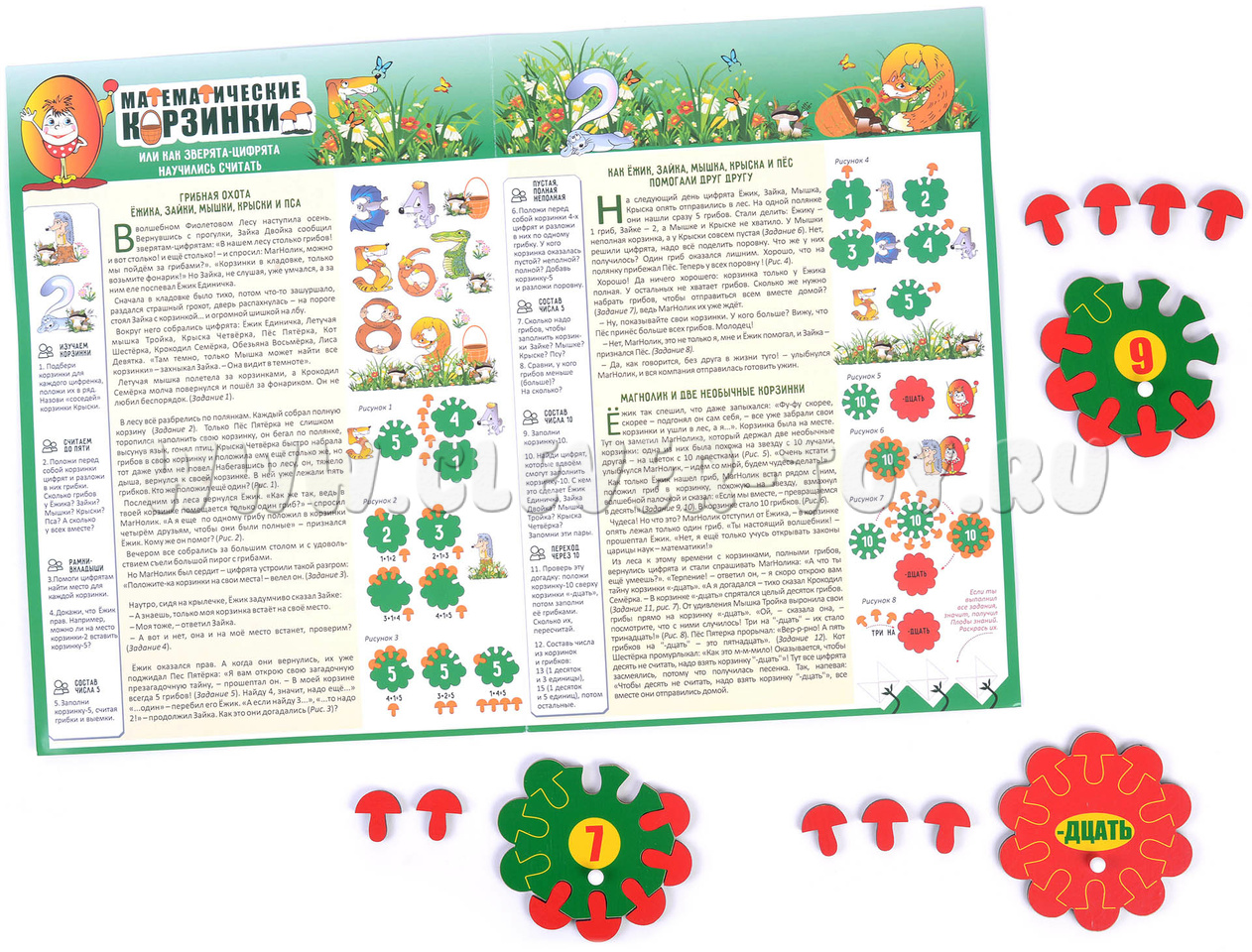 В комплект также входит инструкция с описанием 12-ти увлекательных игр и занятий для обучения ребёнка основам математики. Главные герои игр – зверята-цифрята – любят собирать грибы. У каждого есть своя полянка и своя корзинка. Примеры игр: «Как цифрята поделили грибы», «Кто набрал грибов больше всех?», «Добавь грибок» и другие.