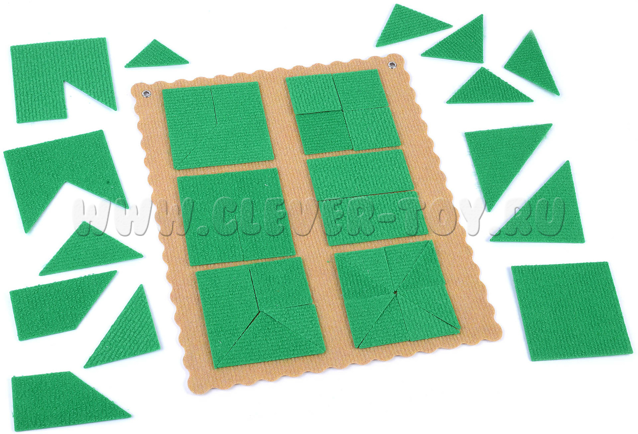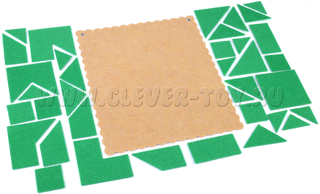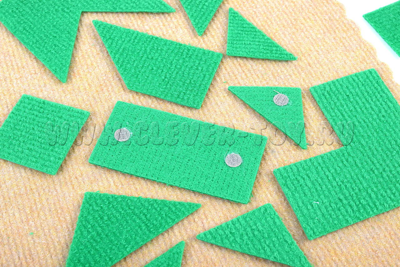 - 36 элементов из ковролина (многоугольник 1 – 1 шт., многоугольник 2 – 1 шт., многоугольник 3 – 1 шт., многоугольник 4 – 1 шт., треугольник маленький – 10 шт., треугольник средний – 7 шт., треугольник большой – 2 шт., квадрат большой – 1 шт., прямоугольник – 2 шт., трапеция 1 - 3 шт., трапеция 2 – 1 шт., квадрат маленький – 6 шт.;