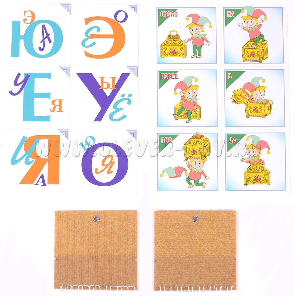1. 48 картонных карточек (100х100мм): 24 игровых с гласными буквами, 24 призовых, обозначающих цвет, размер, положение (предлоги); цветная инструкция с правилами игр;