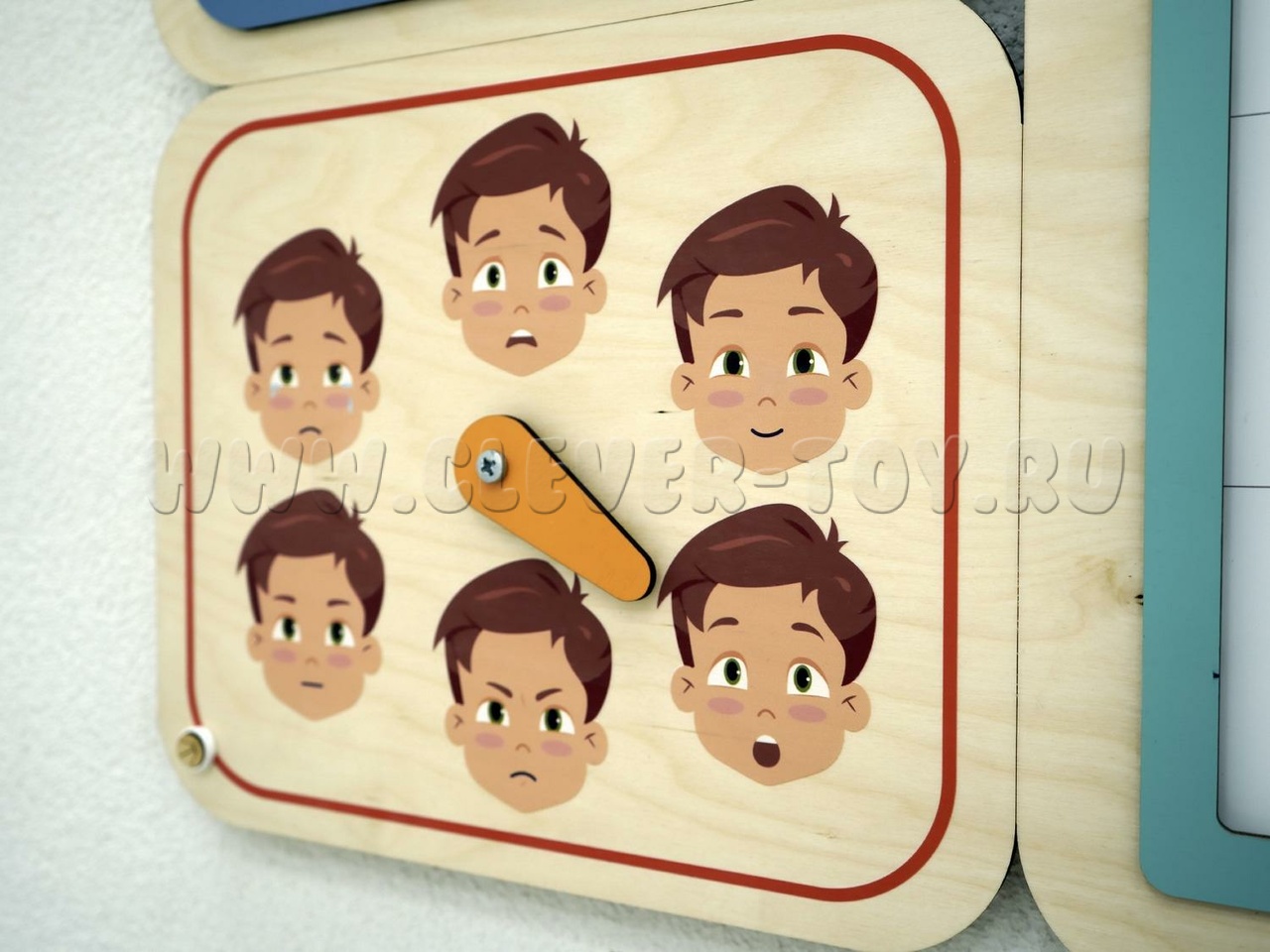• Модуль "Эмоции" со стрелкой и акриловое безопасное зеркало. С его помощью дети учатся распознавать свои и чужие эмоции, выставляют эмоцию на круге и показывают её в зеркале, угадывают эмоции друг друга. Служит для развития эмоционального интеллекта, рекомендован детям с РАС.