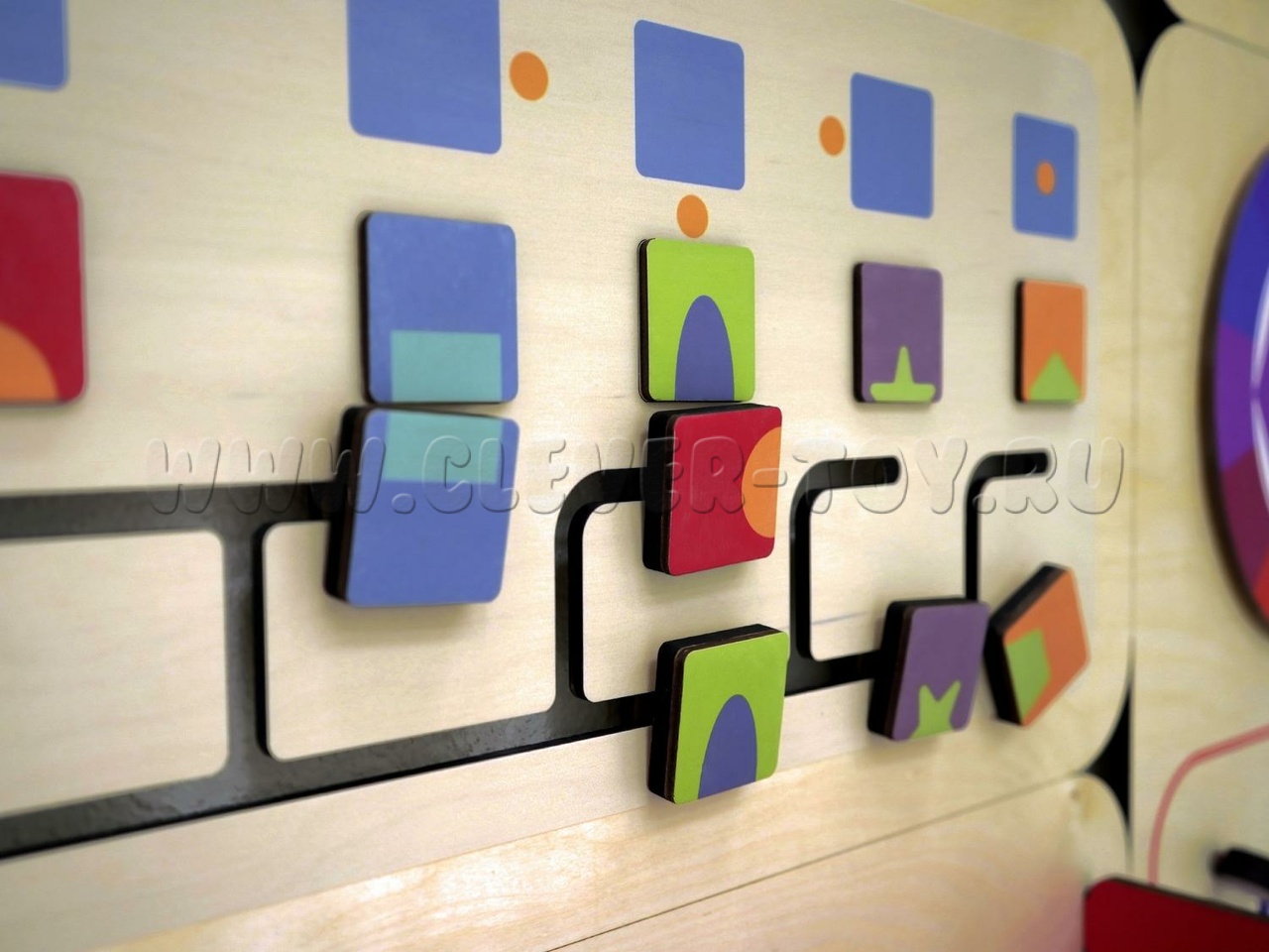 • Доска в клетку и магниты, хранящиеся в ящичках. Это аналог ларчика Воскобовича, только поверхность не ковровая, а магнитно-маркерная. Также фигуры в магнитах могут использоваться для развития ребёнка по системе Фребеля. Дети из фигур собирают картины, которые психолог анализирует.