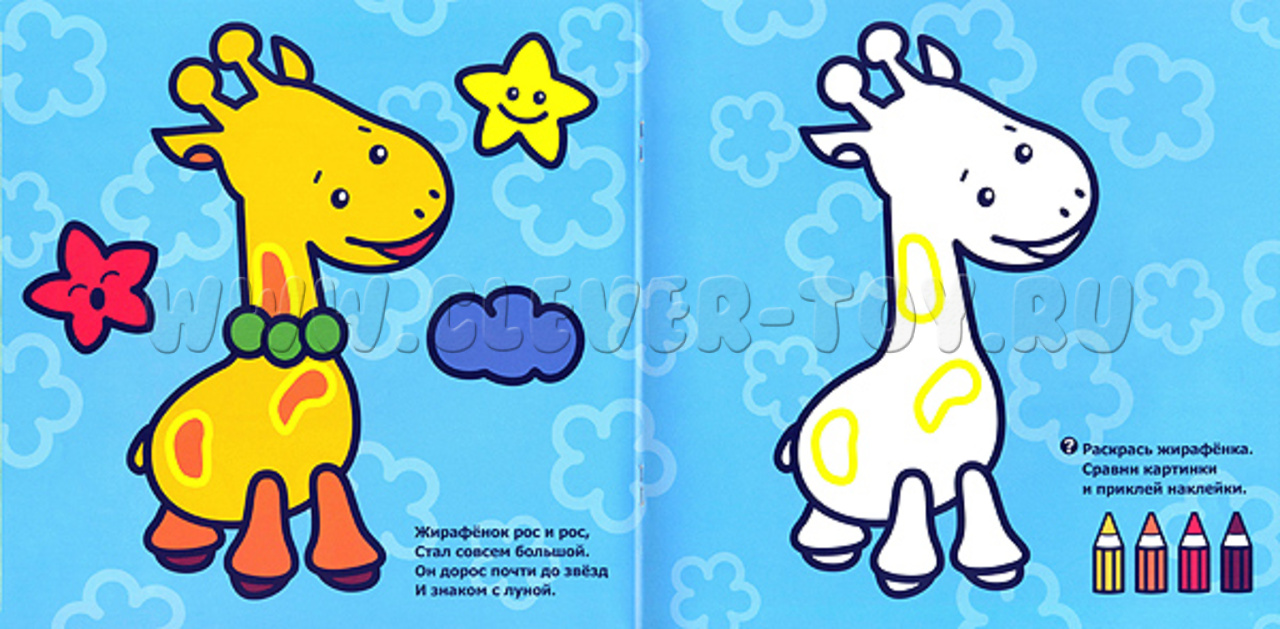 На каждой страничке есть смысловой стишок, относящийся к картинке, а на второй страничке написано развивающее задание. Книжка состоит из 12 мелованных матовых листов и 2 дополнительных страниц с наклейками. Наклейки способствуют развитию мелкой моторики, а толстый контур скрывает неровности. Купить развивающее пособие можно в нашем магазине с доставкой в любой город России!