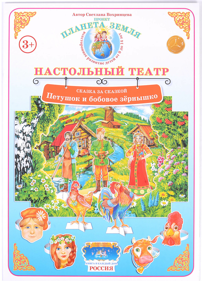 Настольный театр "Петушок и бобовое зернышко" это постановка сказки спомощью объемных фигур связанная с книжным текстом.