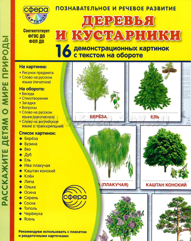 Состав комплекта (16 карточек): Берёза, Бузина, Вяз, Дуб, Ель, Ива плакучая, Каштан конский, Клён, Липа, Ольха, Осина, Сирень, Сосна, Тополь, Черёмуха, Ясень.
