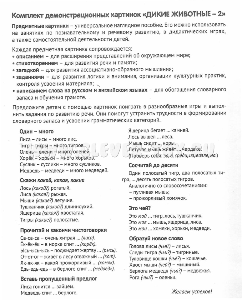На обороте каждой предметной картинки - описание животного, стихотворение, загадка, вопросы для ребёнка, название животного на русском и английском языках. Комплект подходит для индивидуальной и групповой работы, с детьми 3-7 лет.