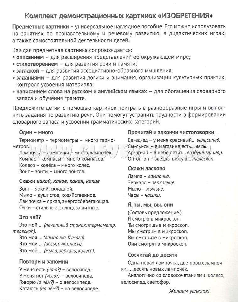 На лицевой стороне каждой карточки дается цветное изображение какого-либо изобретения, на обратной - подробное описание, из которого дети узнают много интересного и поучительного. Для лучшего закрепления материала представлены оригинальные стихотворения и рифмованные загадки по теме, а также вопросы, на которые ребенок ответит после изучения материала или беседы со взрослым. Название каждой статьи имеет перевод на английский язык и транскрипцию.