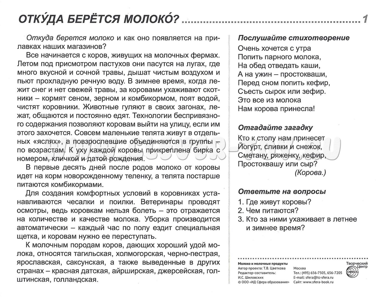 На лицевой стороне каждой карточки дается цветное изображение молочного продукта, на обратной - подробное описание, из которого дети узнают много интересного и поучительного. Для лучшего закрепления материала представлены оригинальные стихотворения и рифмованные загадки по теме, а также вопросы, на которые ребенок ответит после изучения материала или беседы со взрослым. Комплект подходит для индивидуальной и групповой работы, с детьми 5-9 лет.