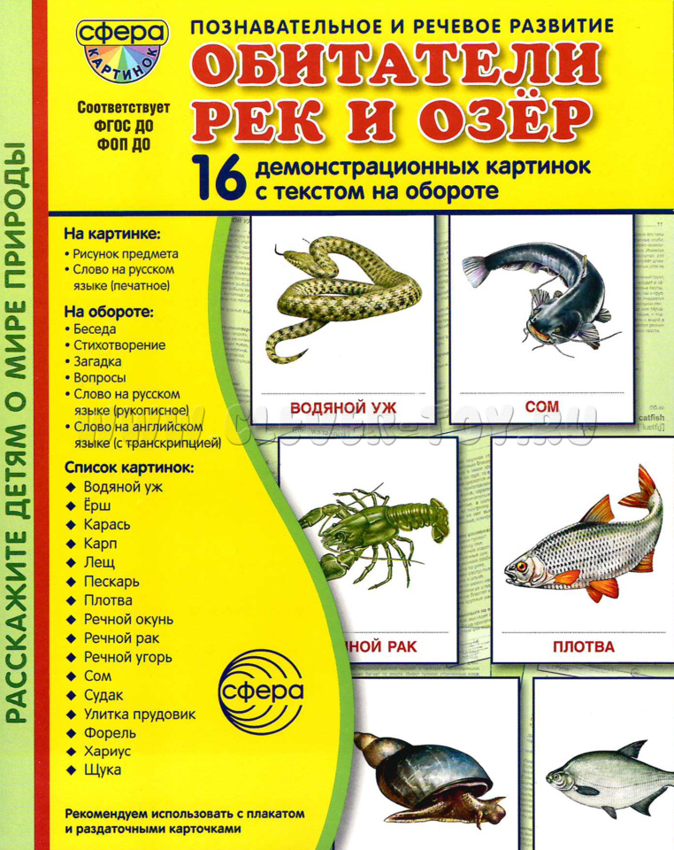 Комплект "Обитатели рек и озер" познакомит детей с удивительным миром пресноводных рыб, моллюсков и даже рептилий. Многие из них уже известны, а о некоторых дети узнают впервые. Издание состоит из 16 цветных картинок с текстом на обороте. Дети не только получат ценную информацию, но и ответят на вопросы, отгадают загадки и прочитают стихотворения.