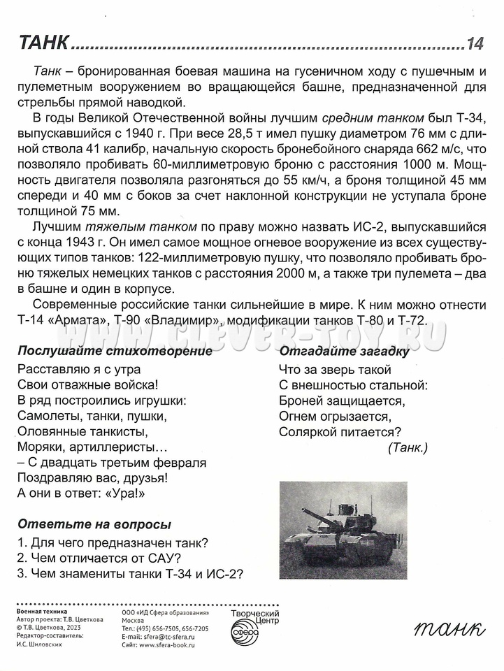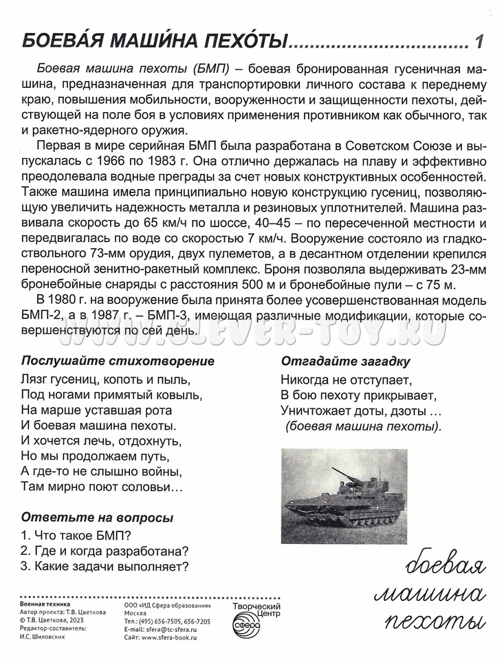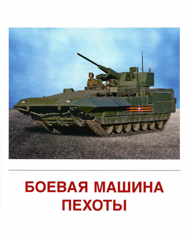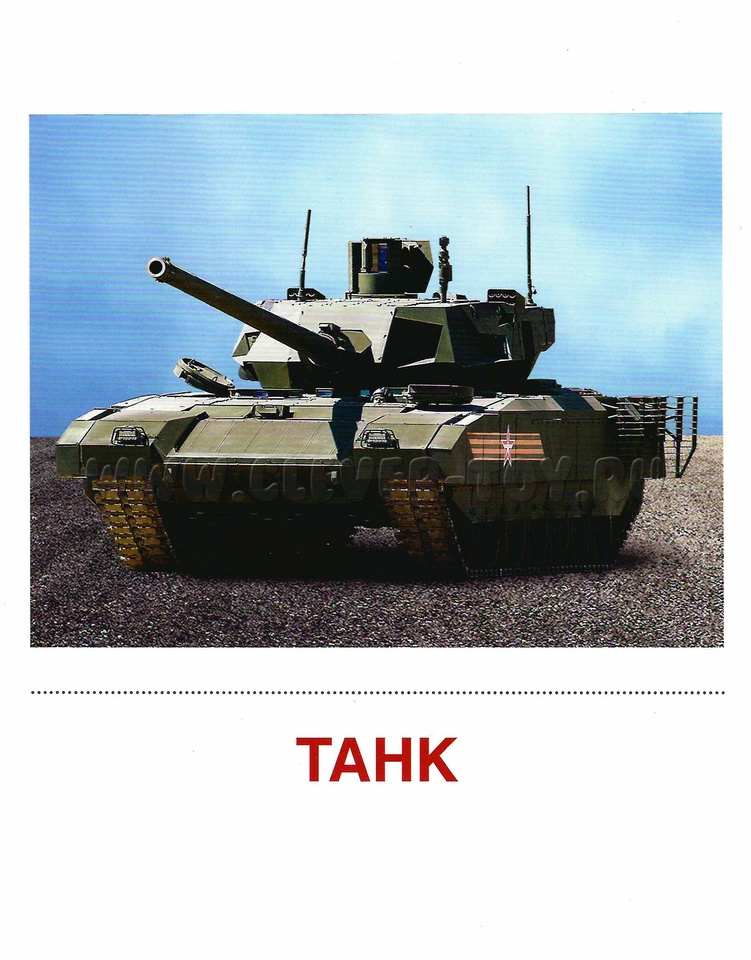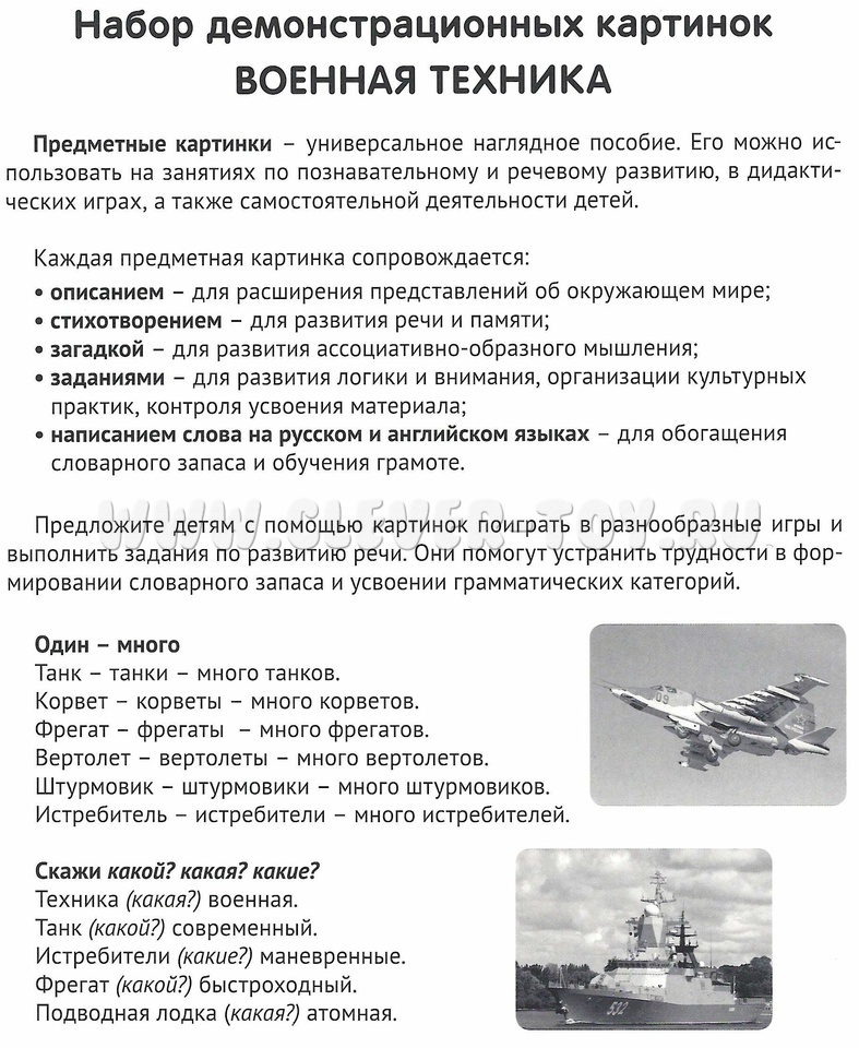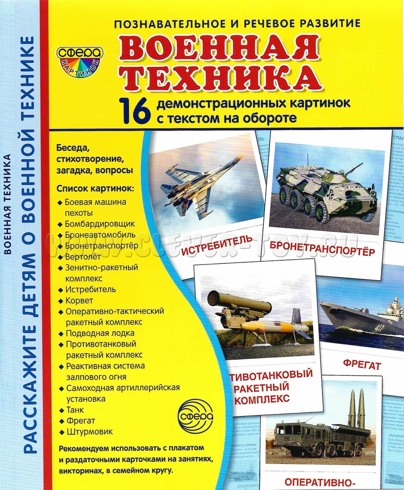 На лицевой стороне каждой карточки есть изображение военной техники, а на обратной - подробное описание. Из описания дети узнают много интересных фактов о военной службе и образцах вооружения.