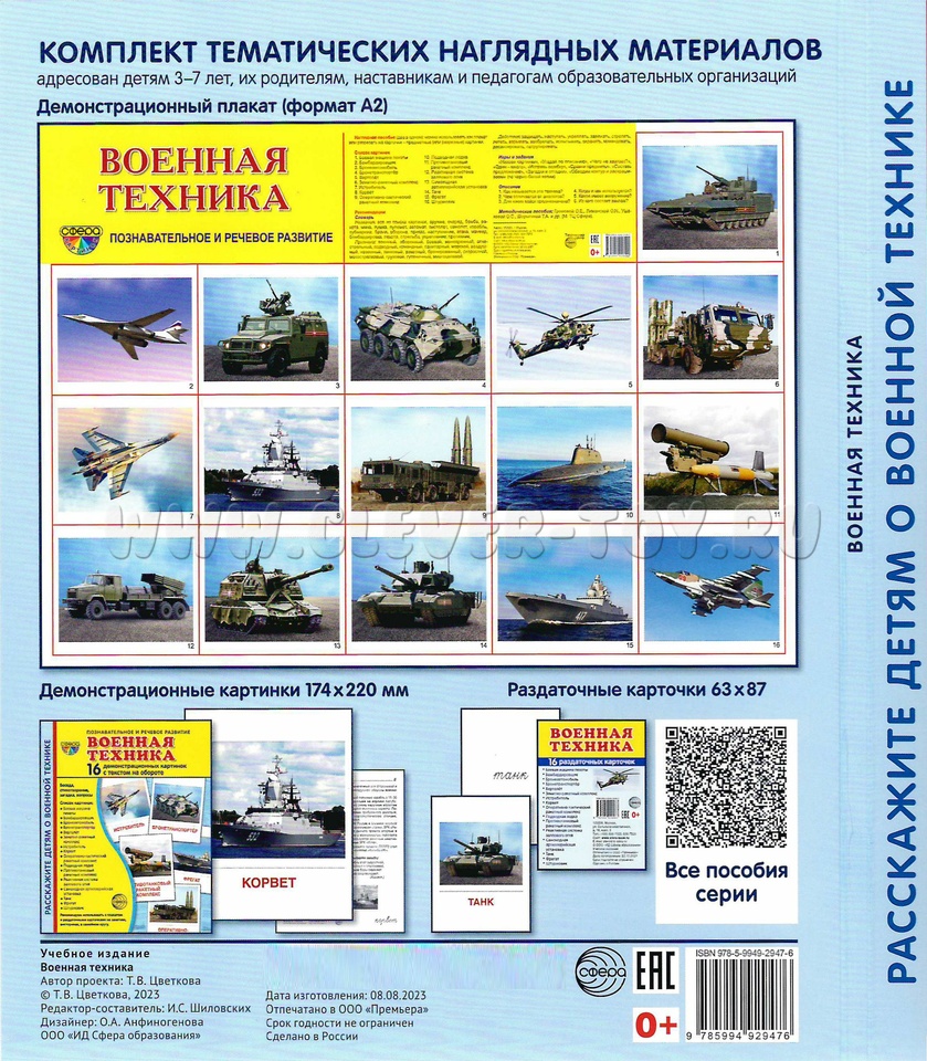 В комплект входит 16 цветных демонстрационных карточек с изображением военной техники. Они предназначены для детей и их родителей, которые хотят узнать больше о современных военных профессиях и жизни военнослужащих разных родов войск.