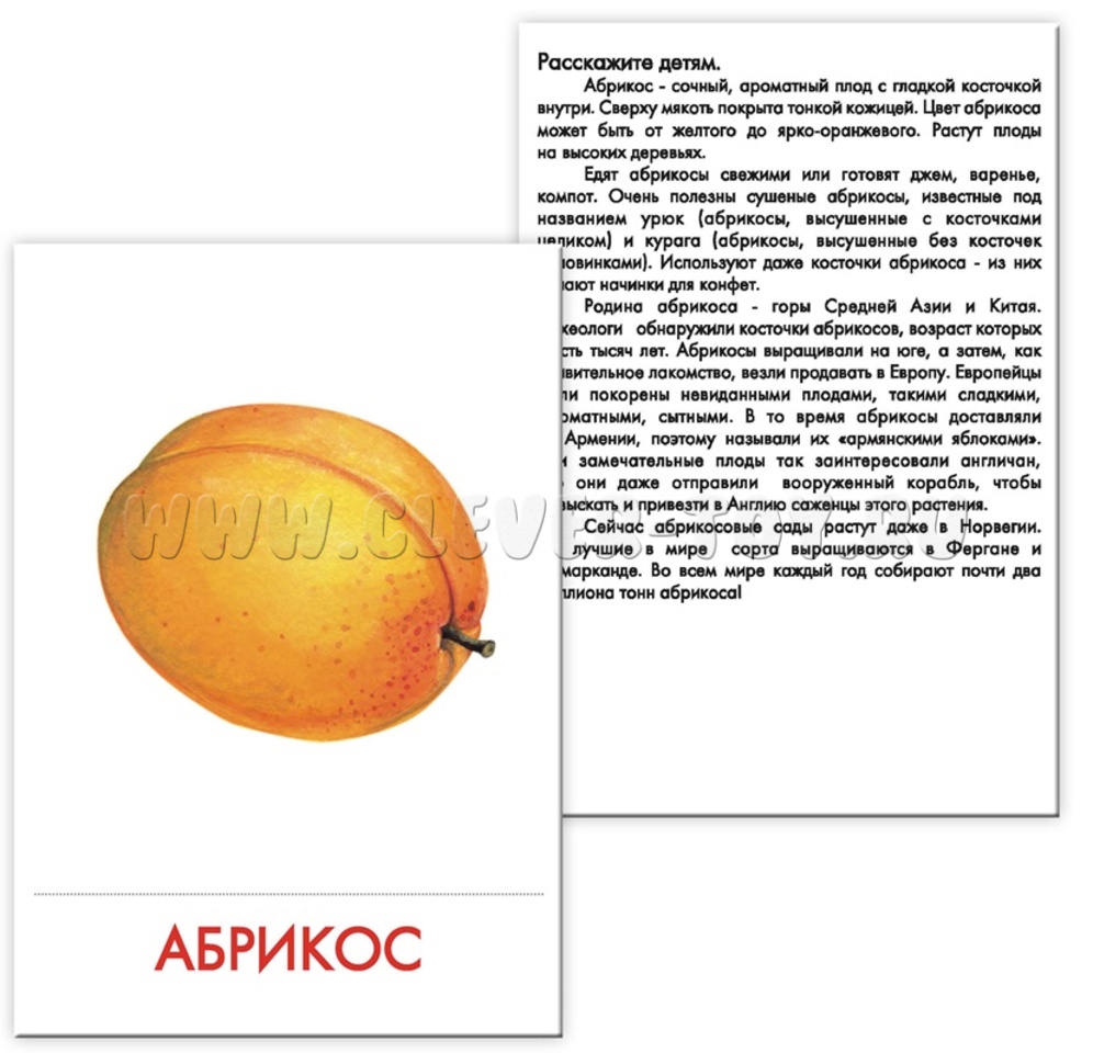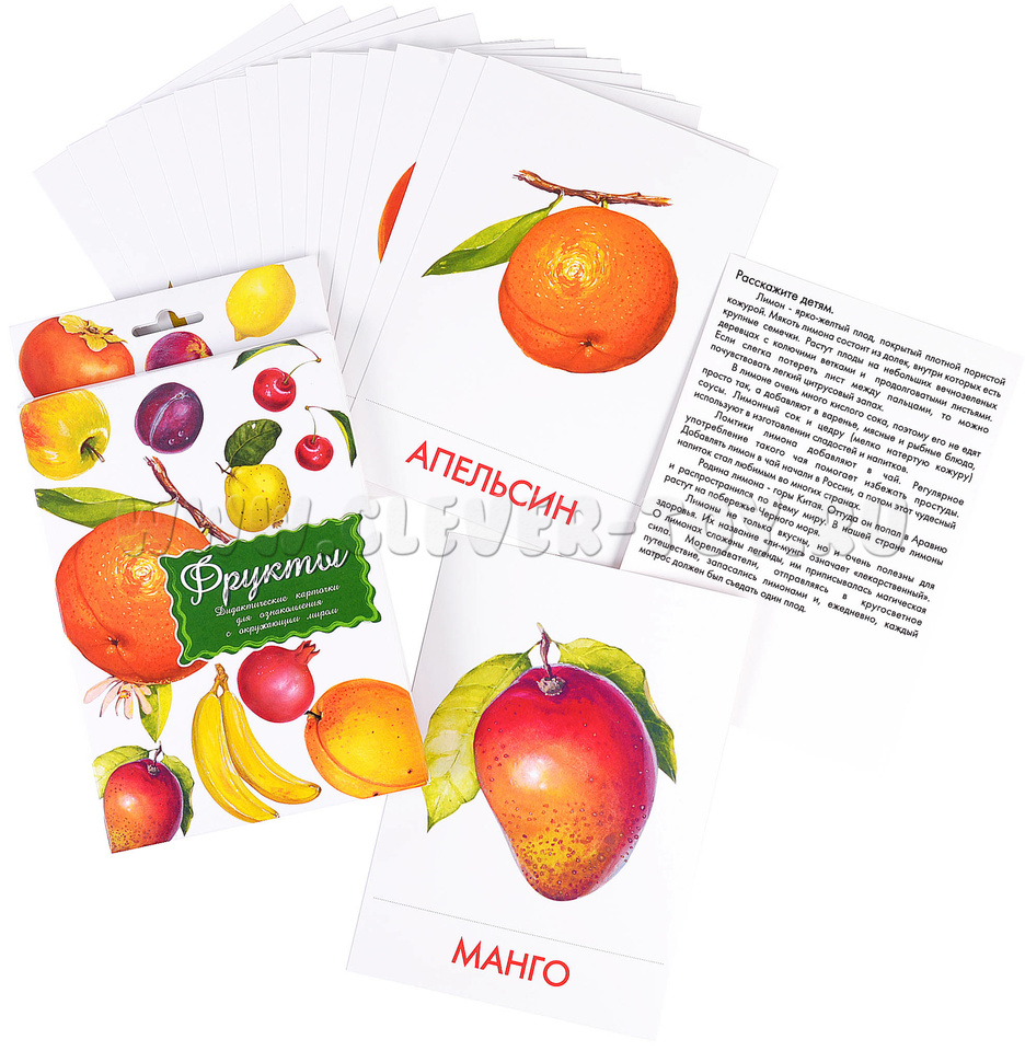 На одной стороне карточки расположена яркая картинка с изображением и названием фрукта, на обратной стороне – доступная и интересная для ребёнка информация о фруктах (описывает внешний вид фрукта, область произрастания, интересные факты о применении фруктов).