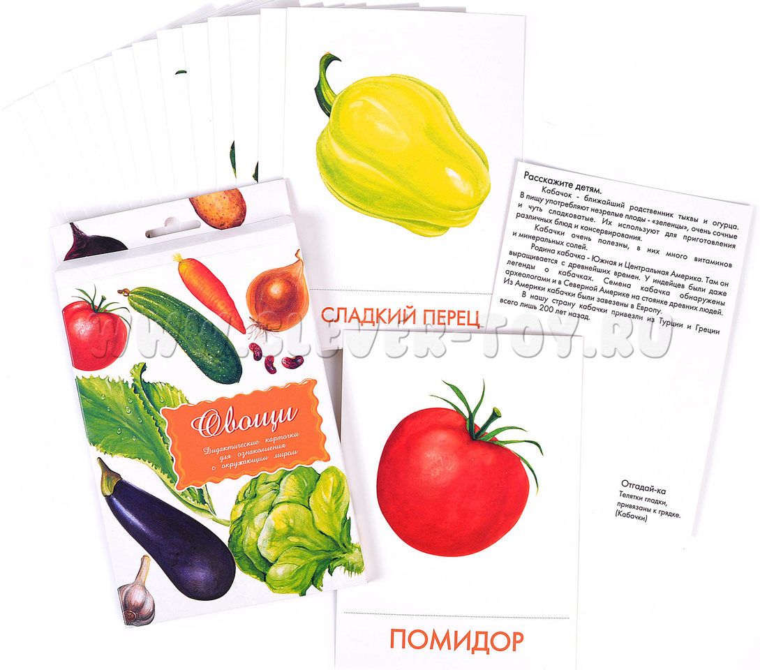 Карточки выполнены из плотного матового картона. С одной стороны нанесены рисунки, с овощами, а с другой стороны очень познавательная и интересная информация, включающая загадки. Игра состоит из 16 карточек и коробки. На обратной стороне коробки написаны примеры игр с детьми. Задача этой серии расширить кругозор, словарный запас и логическое мышление.