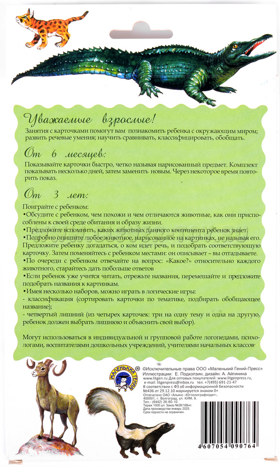 • Подробно опишите любое животное, изображённое на картинке, не называя его. Предложите ребёнку догадаться, о чем идет речь и подобрать соответствующую карточку. Затем поменяйтесь с ребёнком местами: он описывает, вы отгадываете.