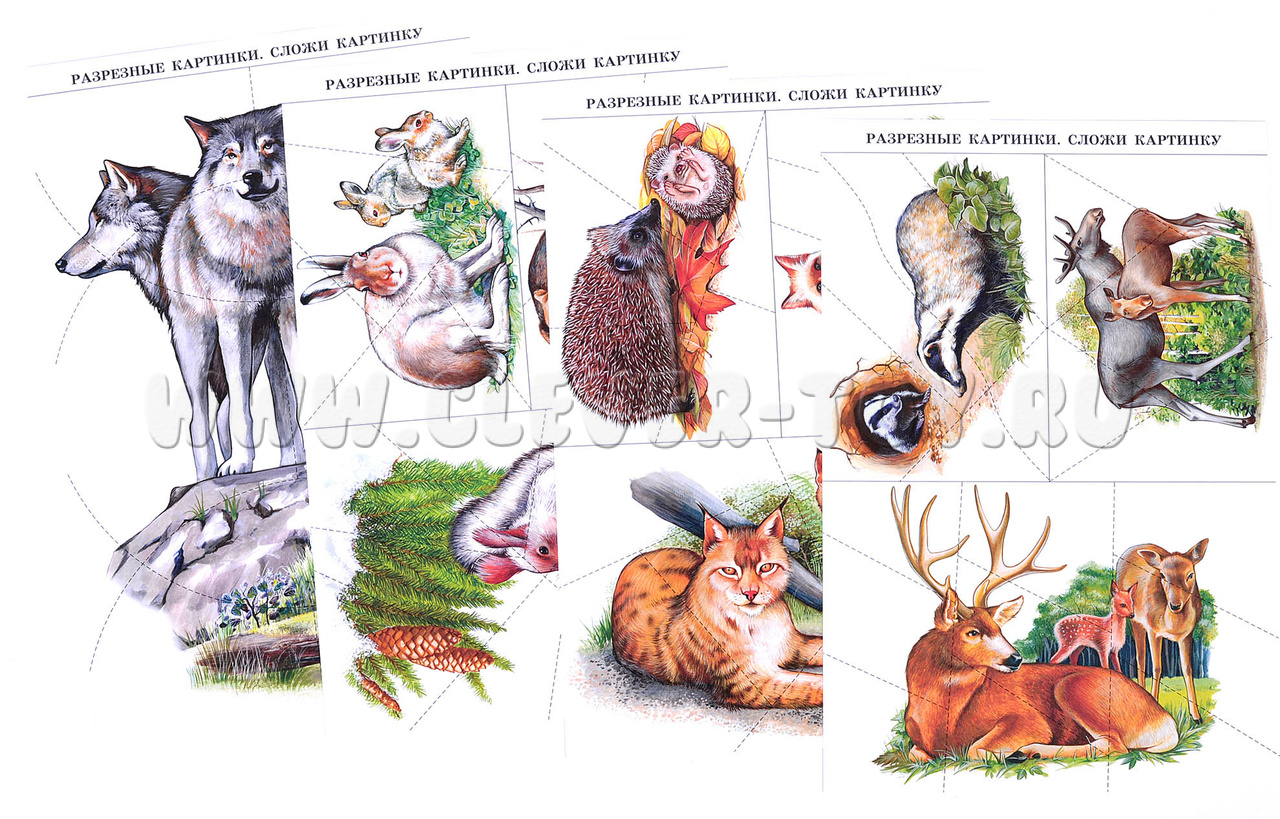 - 10 натуралистичных изображений диких животных (Ёж, бурый медведь, лось, волк, заяц, белка, олень, лиса, рысь, барсук), на обратной стороне - их описание, ареал обитания, особенности поведения, питания, образа жизни;