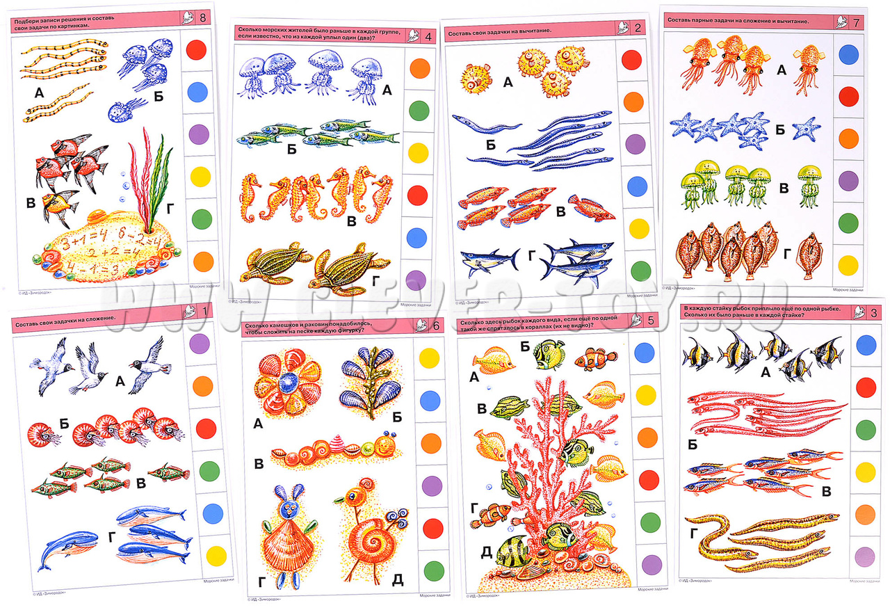 Как правило, к 6–7 годам ребёнок уже может правильно и творчески решать простейшие арифметические задачи. Задания комплекта объясняют логическую структуру задачи (условие, вопрос, решение, ответ), благодаря чему ребёнок осмысленно различает все вышеупомянутые логические звенья задачи, выбирает нужные арифметические операции (при этом в задачах на 2 действия соблюдает правильную последовательность), понимает значение глаголов, указывающих в задаче на увеличение или уменьшение количества (приплыли-уплыли), различает смысл вопросов (Сколько будет? Сколько было? Сколько осталось? На сколько меньше?). Примеры заданий в карточках: 1а. Сколько дельфинов станет в каждой стайке, если приплывёт ещё один дельфин? 3а. Сколько рыбок станет, если приплывут ещё две? 4а. Сколько медуз останется, если из каждой стайки уплывут по две? 6а. Сколько раковин будет в каждой коллекции, если добавить к ним ещё 1 или 2. 7а. Сколько ног спрятал каждый осьминог?