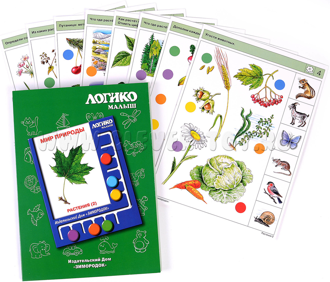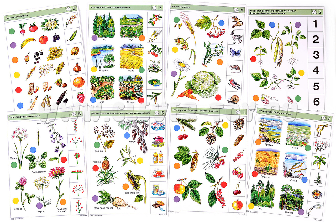 В процессе решения заданий ребёнок будет не только узнавать и называть новые и уже хорошо ему известные виды растений, но и называть их отдельные части, подбирать пары лист-плод и вершки-корешки, верно выстраивать этапы развития растений, искать различия и общие признаки у разных видов. Задания по теме равномерно распределены на два комплекта карточек Растения (1) и Растения (2), и не повторяются. Примеры заданий в карточках: 2б. Как растёт огурец: от семечка до семечка. 3б. Как можно назвать растения в каждом ряду одним словом? 4б. Чем и как питаются животные? 5а. Из каких растений изготовлены эти продукты питания? 7б. Что растёт в лесу, в водоёме, на лугу, в поле, в огороде, в саду?