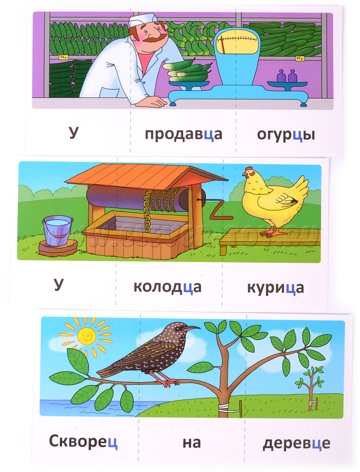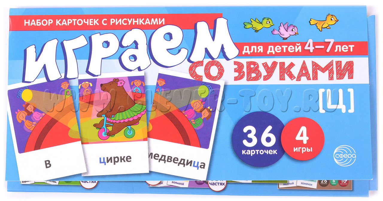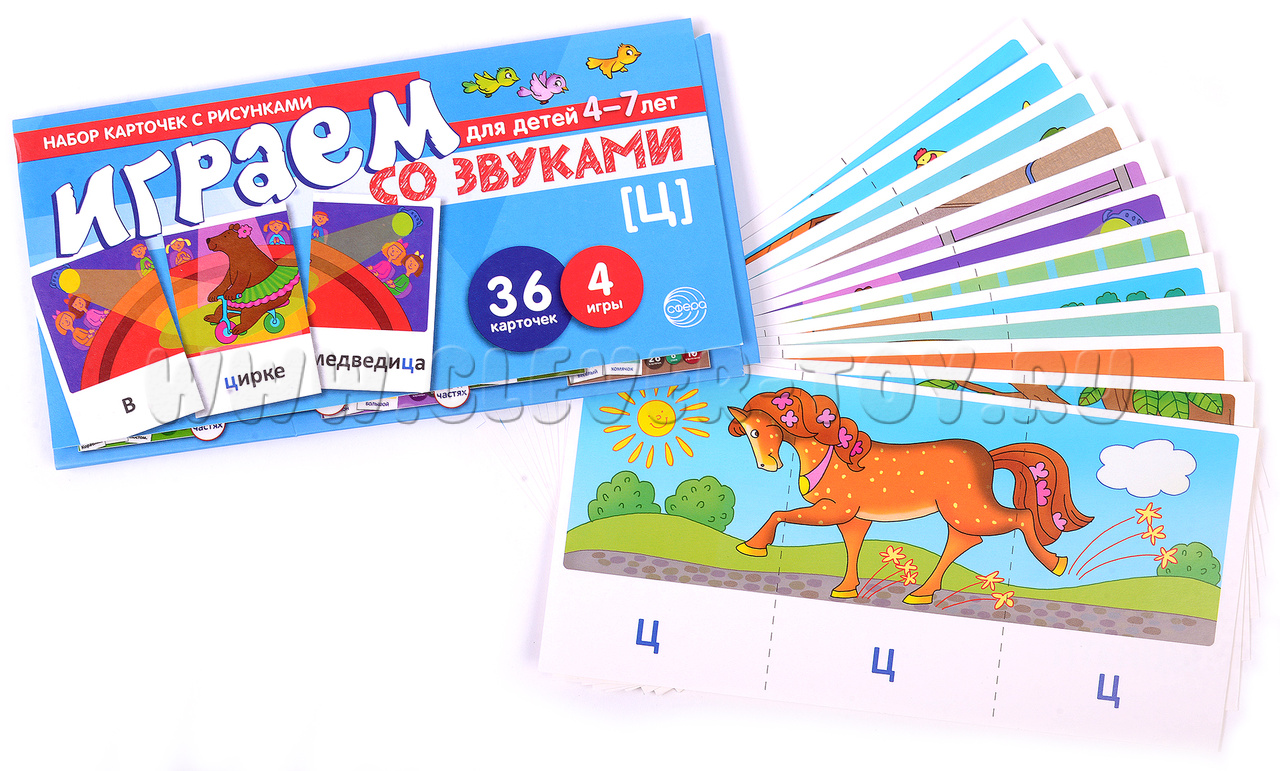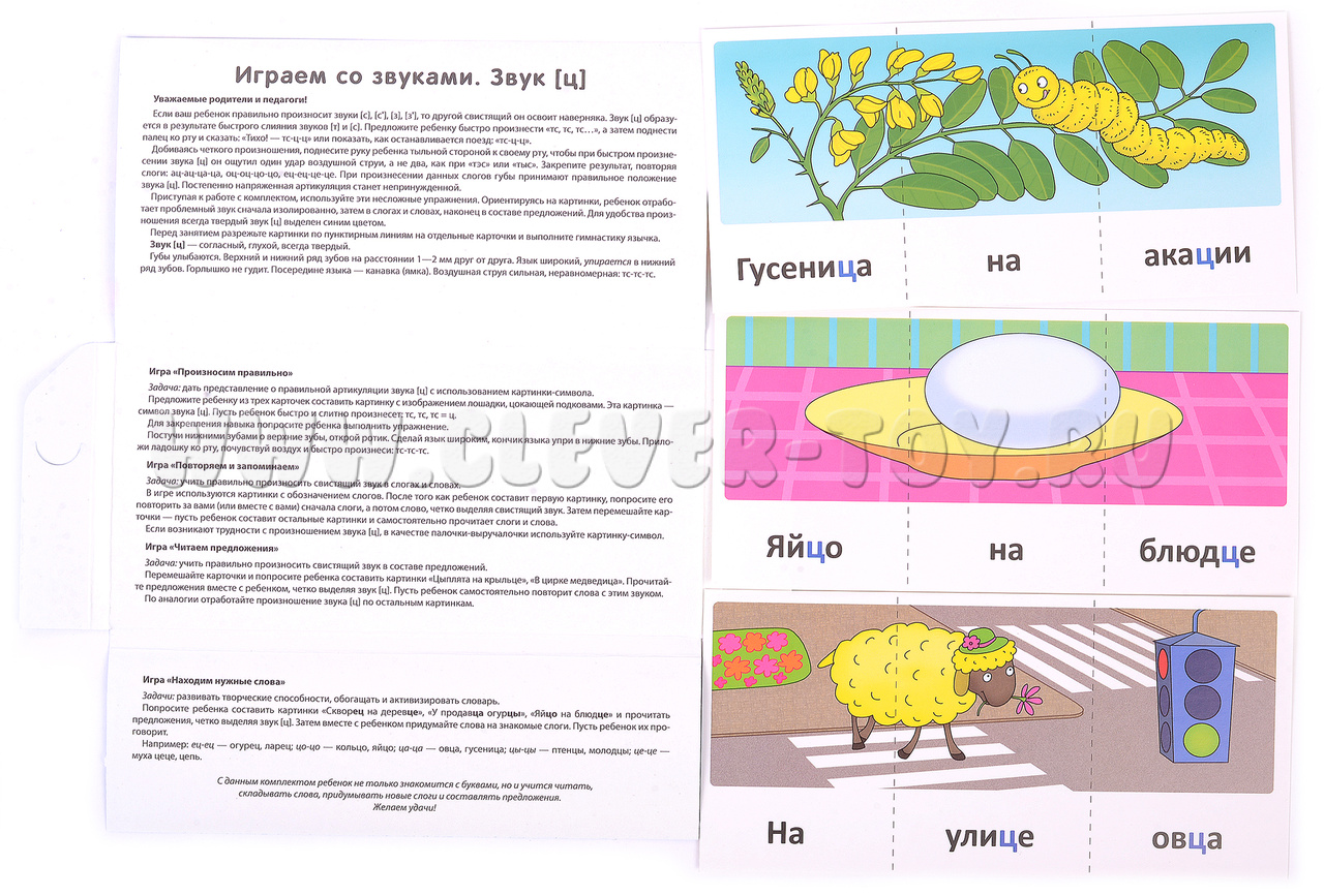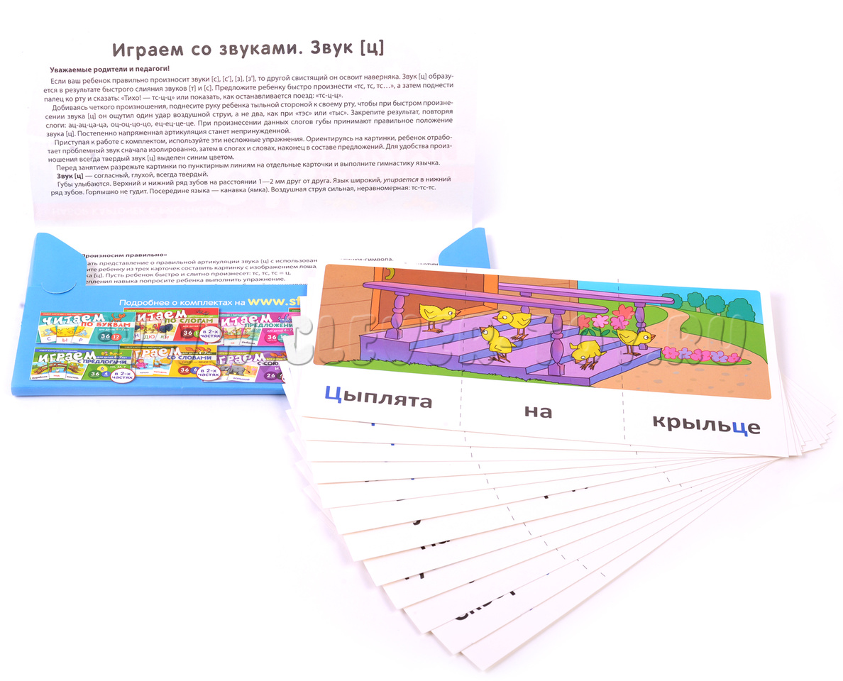 Издание для обучения детей 4-7 лет чтению представляет собой 12 обучающих картинок, состоящих из 36 карточек и 4 игр, и является тематическим продолжением комплекта "Играем со звуками. Звуки [з], [з']", выпущенного издательством "ТЦ Сфера". В игровой форме ребенок познакомится со свистящим звуком [ц], научится правильно его произносить, выполнит гимнастику язычка и артикуляционные упражнения. Каждая из представленных игр направлена на отработку звука изолированно, в слогах, словах и в составе предложений.