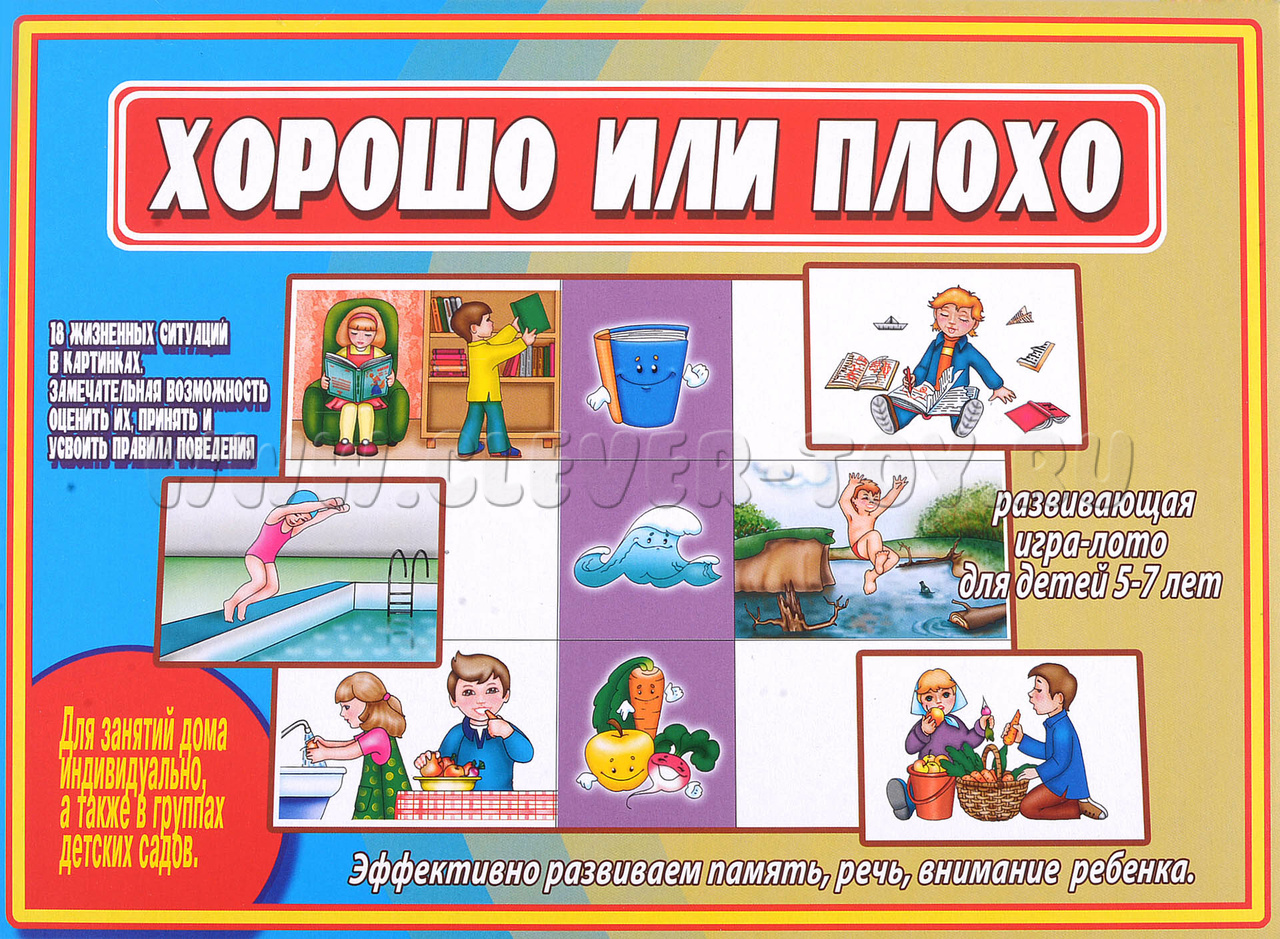 1 игра. Перед началом игры поговорите с ребёнком о том, что означают понятия «хорошо» или «плохо». Малыши должны дать развёрнутый ответ. Возьмите большие карты, где в центральном столбике изображены темы, предметы ситуаций, а слева и справа — варианты поведения детей. Ребята должны отследить каждую ситуацию по горизонтали, рассказать, что они наблюдают, и выложить на пустое место свою фишку-оценку поведения детей на картинке. Малыши должны обязательно объяснить свой выбор.