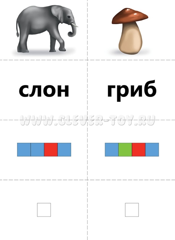 1. Это игра для индивидуальных и/или групповых занятий. Цель игры: подобрать слово и две схемы (звуковую и слоговую) к каждой из картинок. Если участвует группа детей, карточки с картинками (картинки можно заменить на слова) раздаются игрокам поровну, а ведущий начинает показывать поочередно карточки со словами (картинками) и схемами. Подходящие карточки участники забирают себе, побеждает тот, кто быстрее и правильнее всех соберет свои карточки;