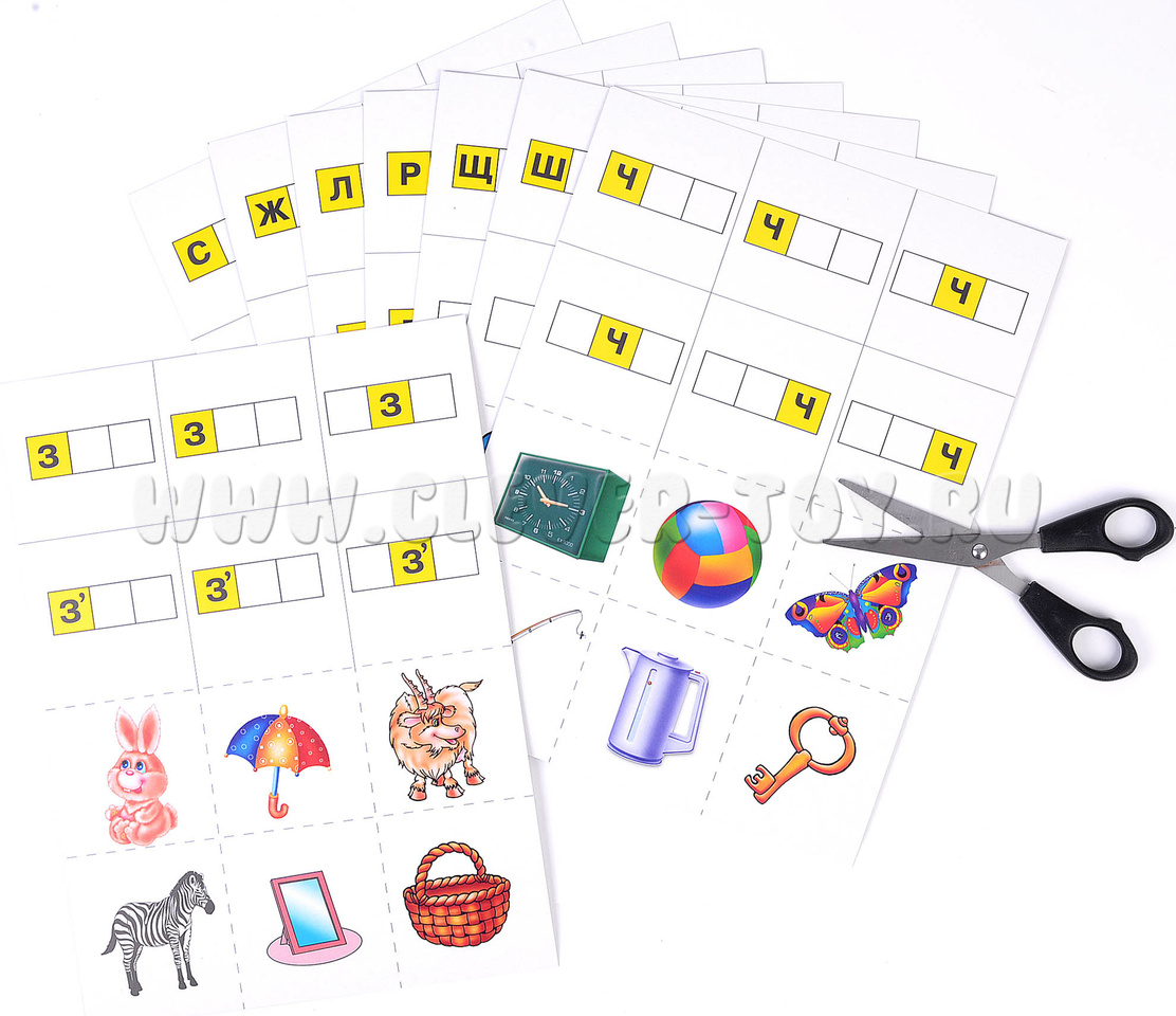 В состав набора входят 8 листов формата А4 и папка для хранения материалов. На каждом листе по 6 разрезных карточек (всего 48) и по 6 схем слов на каждый из "проблемных" согласных звуков. Перед началом игры родителю или педагогу необходимо разрезать карты по пунктирным линиям (получится 48 карточек с картинками и 8 карт со схемами слов).