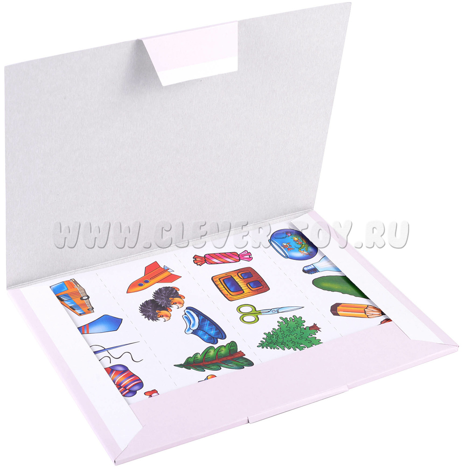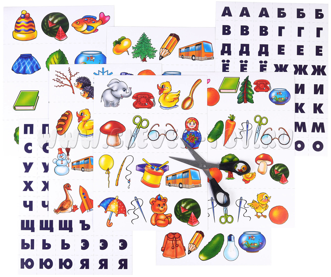 Количество: 2 разные карты с буквами русского алфавита (по 3 одинаковых буквы, всего 96 карточек); 6 разрезных карт с рядами картинок (по 4 ряда на каждой, всего 24, каждый ряд включает в себя от 3 до 6 изображений в зависимости от их размера)